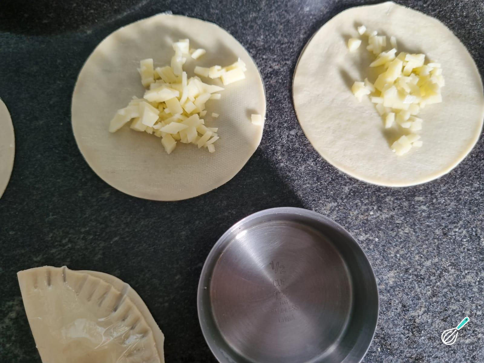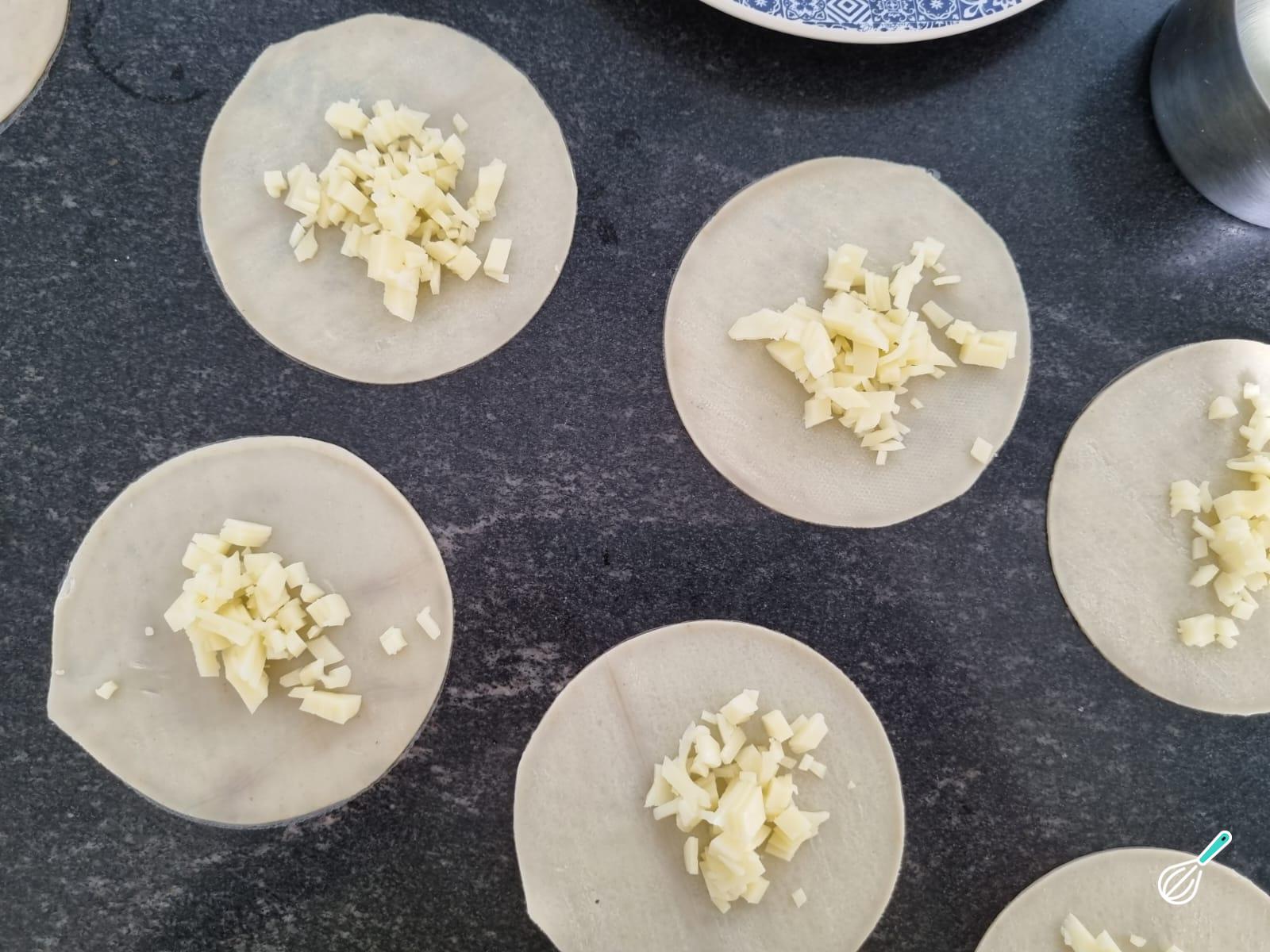 Separe as massas, retire o plástico, coloque o queijo. Eu usei o queijo muçarela, mas pode ser queijo prato, queijo do reino, queijo minas ou o que você preferir.