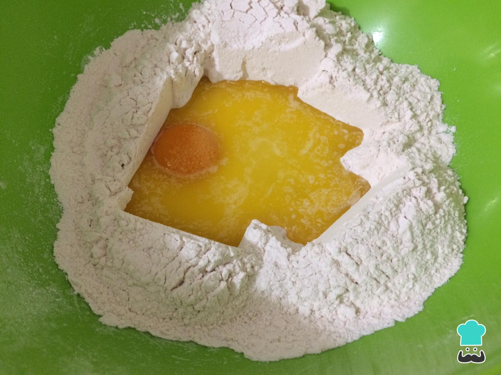 Coloque a farinha num bowl e abra um buraquinho no centro. Coloque nesse buraquinho o leite, a manteiga derretida, um ovo, sal e açúcar. Misture todos estes ingredientes de massa de pastel doce até homogeneizar.