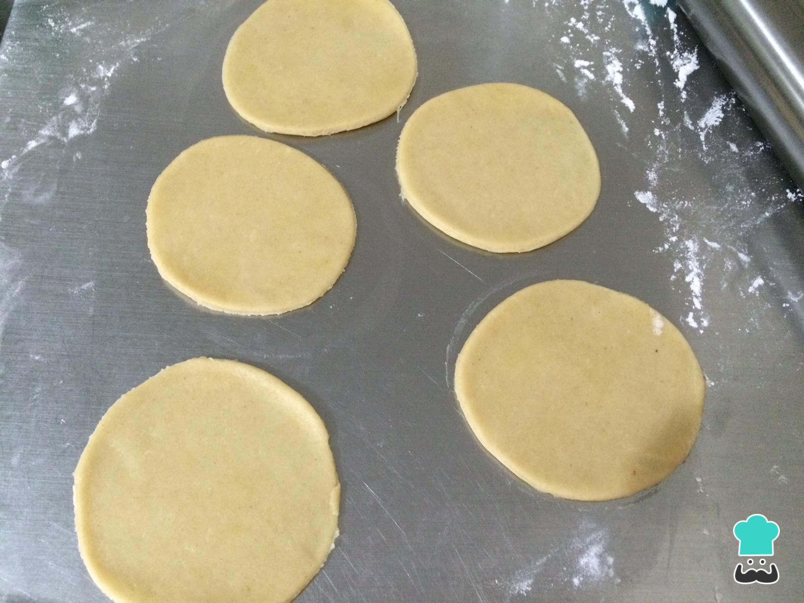 Ligue o forno nos 180ºC. Corte a massa em discos usando um cortador de pastel, copo redondo ou outro utensílio semelhante.