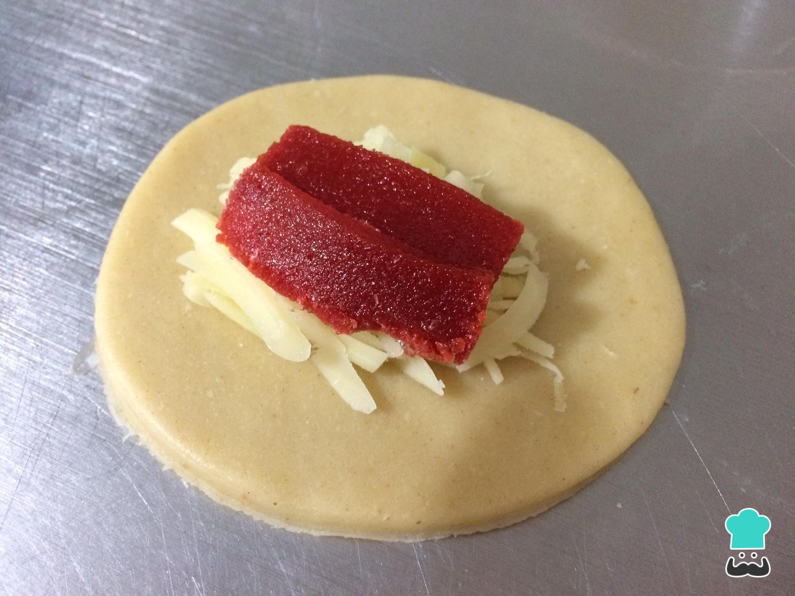 Em cada disco de massa coloque um pouco do queijo mussarela e de goiabada - não exagere na quantidade para o recheio não vazar no forno.