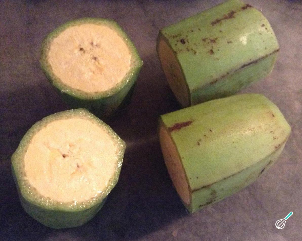 Pegue as bananas verdes e corte em rodelas grossas, com cerca de 2-3 dedos de espessura. Descasque.