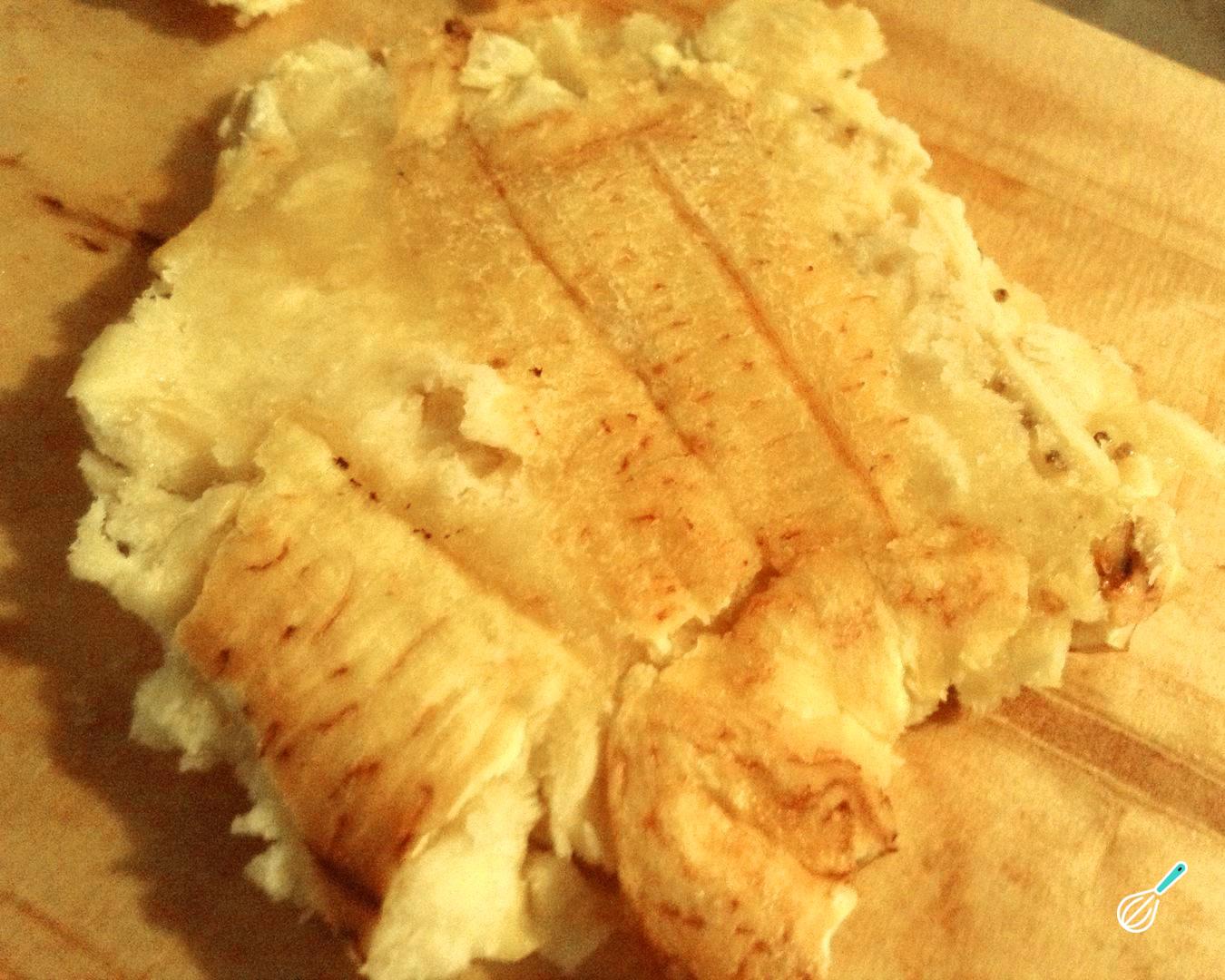 Dica: Recomendo usar a banana da terra verde e descascar a banana somente após cortar, para que o corte seja mais fácil.