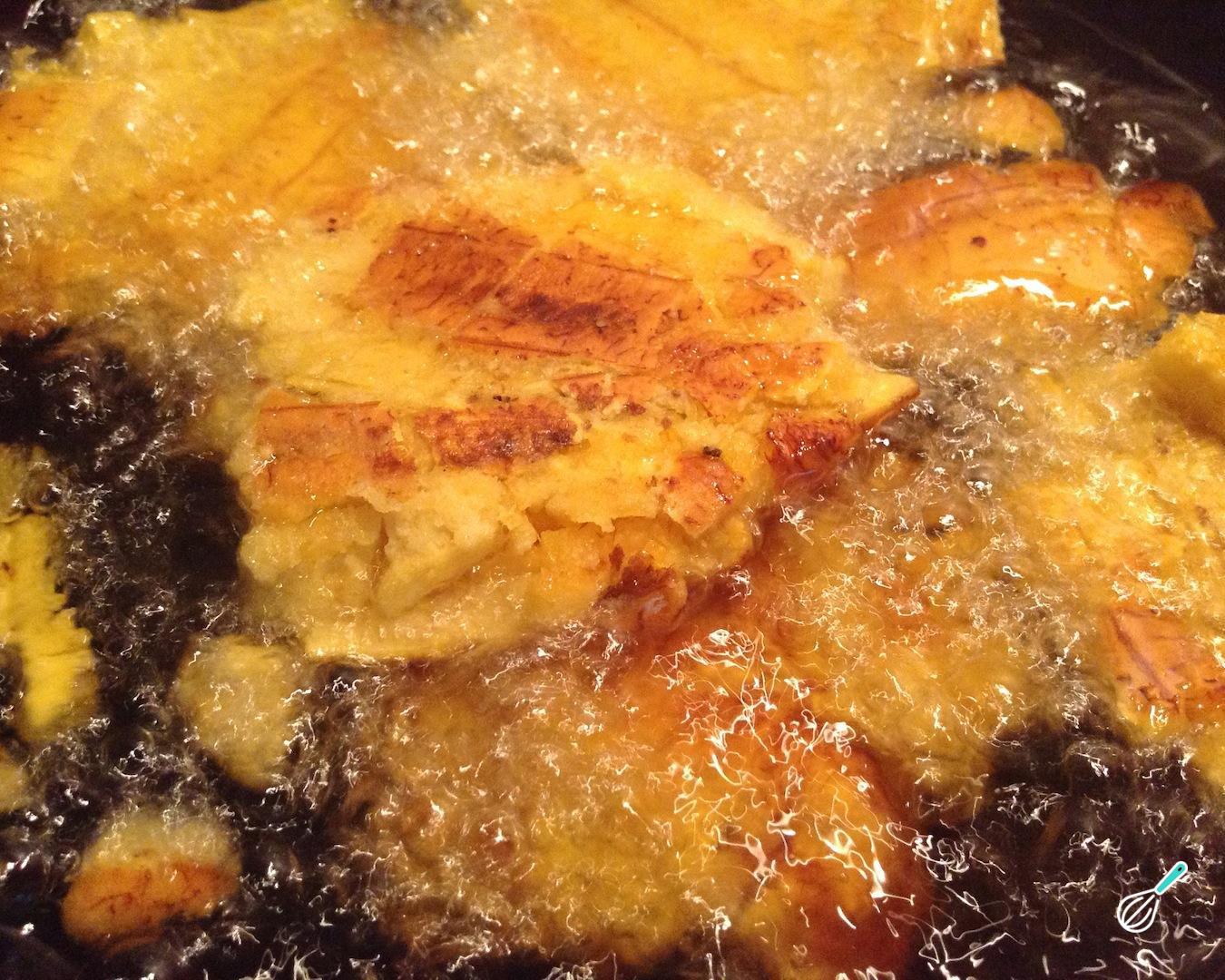 Dica: Em algumas regiões da Colômbia os patacones esmagados são temperados com suco de limão e alho antes de fritar novamente. Se você quiser pode temperar desse jeito também ou usar somente sal, como indicado no passo seguinte.