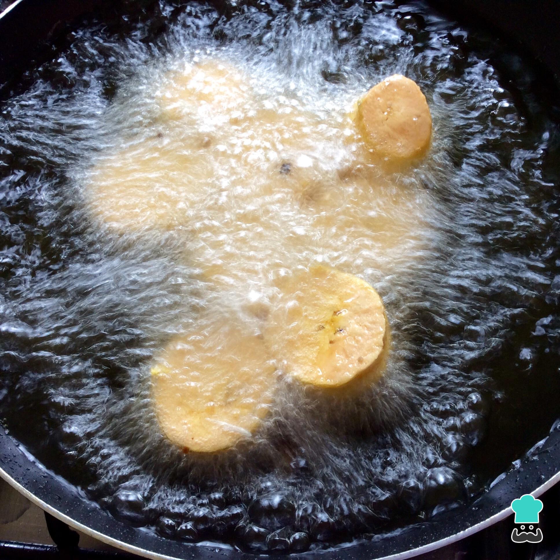 Esquente óleo abundante em uma panela e, quando estiver quente, frite a banana descascada e cortada em pedaços com cerca de 3cm de grossura. O tempo ideal de fritura será de 4 minutos.