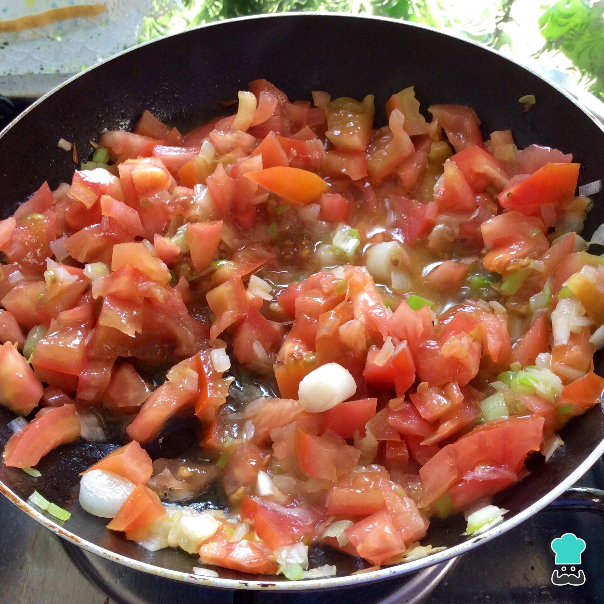 Para fazer o hogao, que será a outra opção de acompanhamento dos patacones, coloque um pouco de óleo em uma frigideira e acrescente o restante alho-poró ou cebola e o tomate também picado finamente. Tempere com sal e pimenta a gosto e cozinhe por 5 minutos tampado, até que fique espesso.