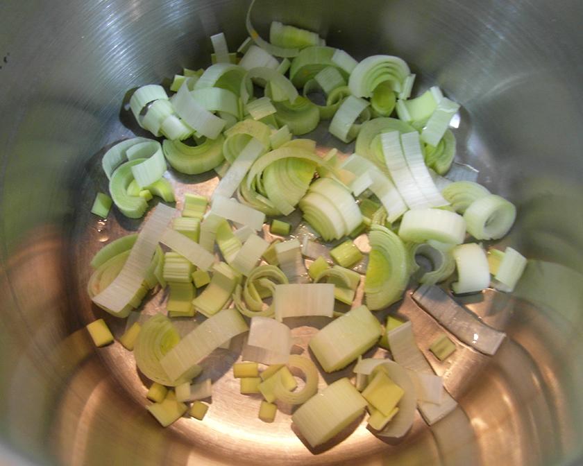 Comece por lavar e picar finamente o alho poró, incluindo a parte verde. Leve ao fogo médio-baixo uma panela com a manteiga e, quando derreter, adicione o alho-poró e refogue até ficar macio. Desligue e deixe esfriar um pouco.