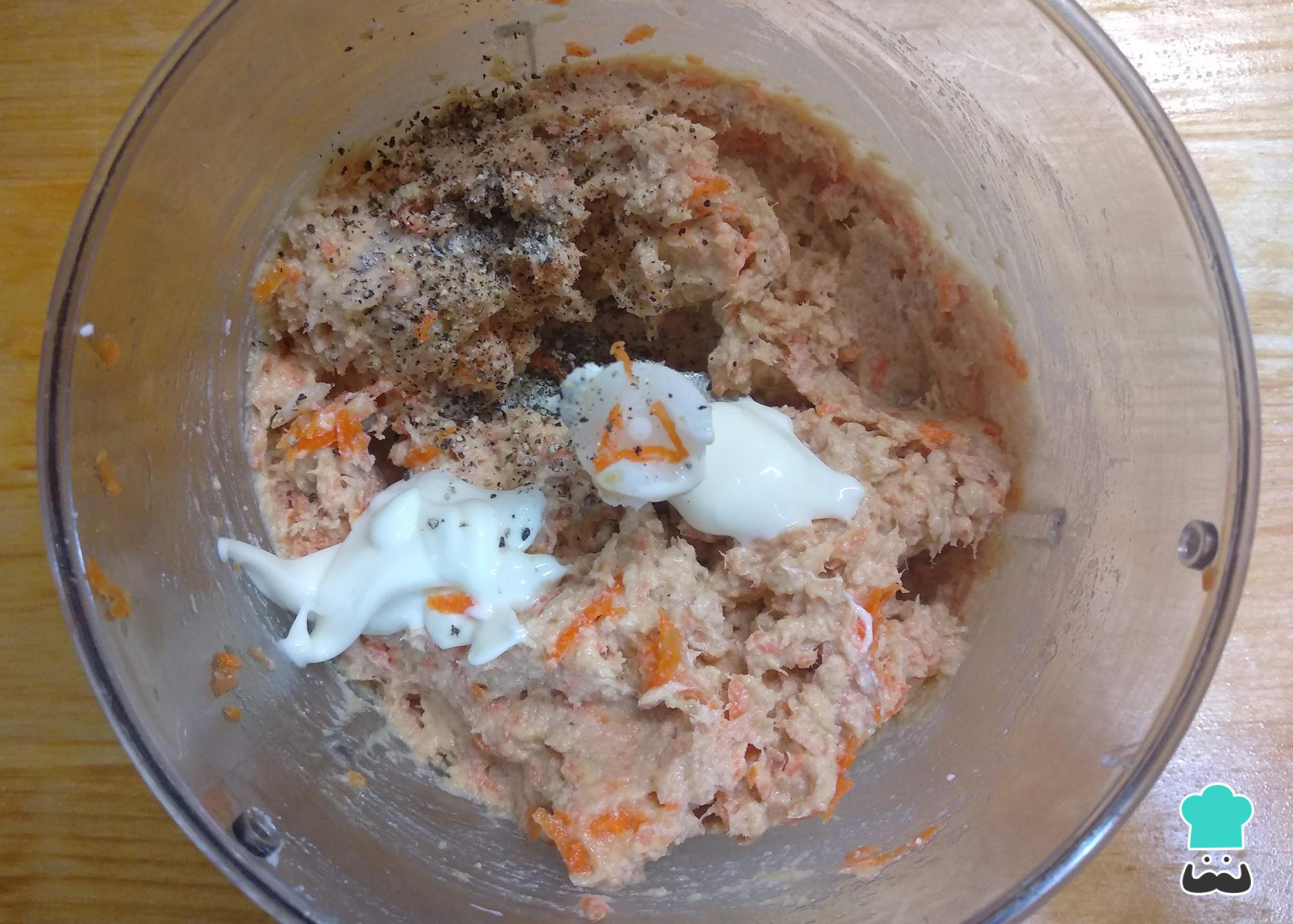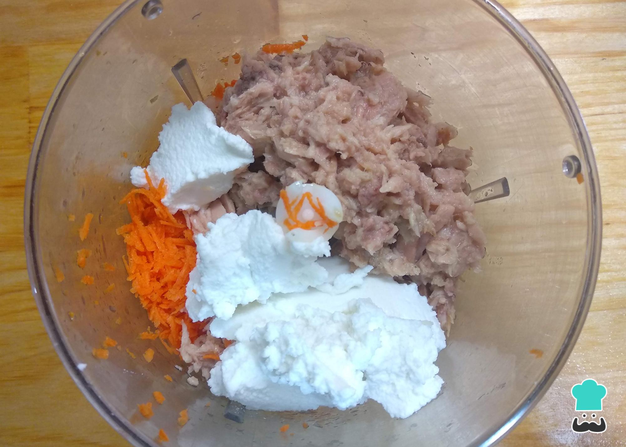 Num processador de alimentos coloque a cenoura, a cebola, o atum e a ricota e bata até virar uma pasta.