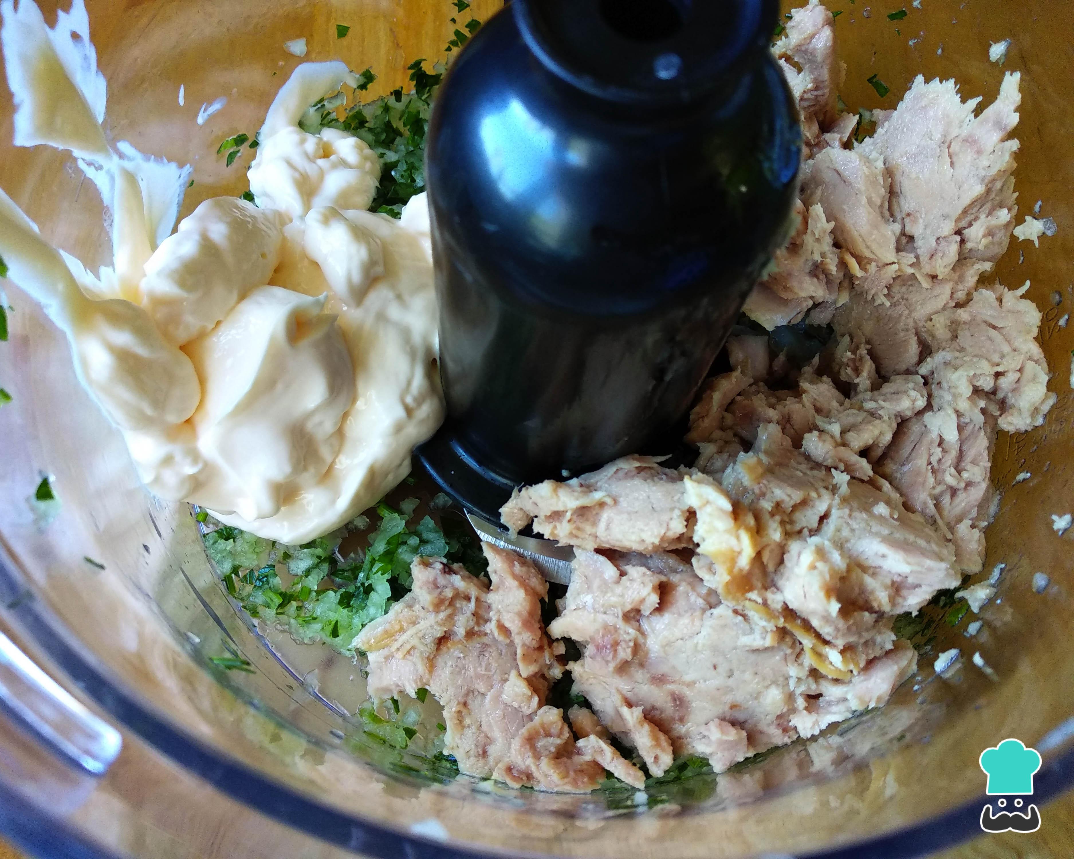 Coloque a cebola e a salsinha no processador e bata um pouco, somente para triturar melhor os pedaços. Depois coloque o atum escorrido e a maionese e bata para misturar e desfazer os pedaços de atum.
