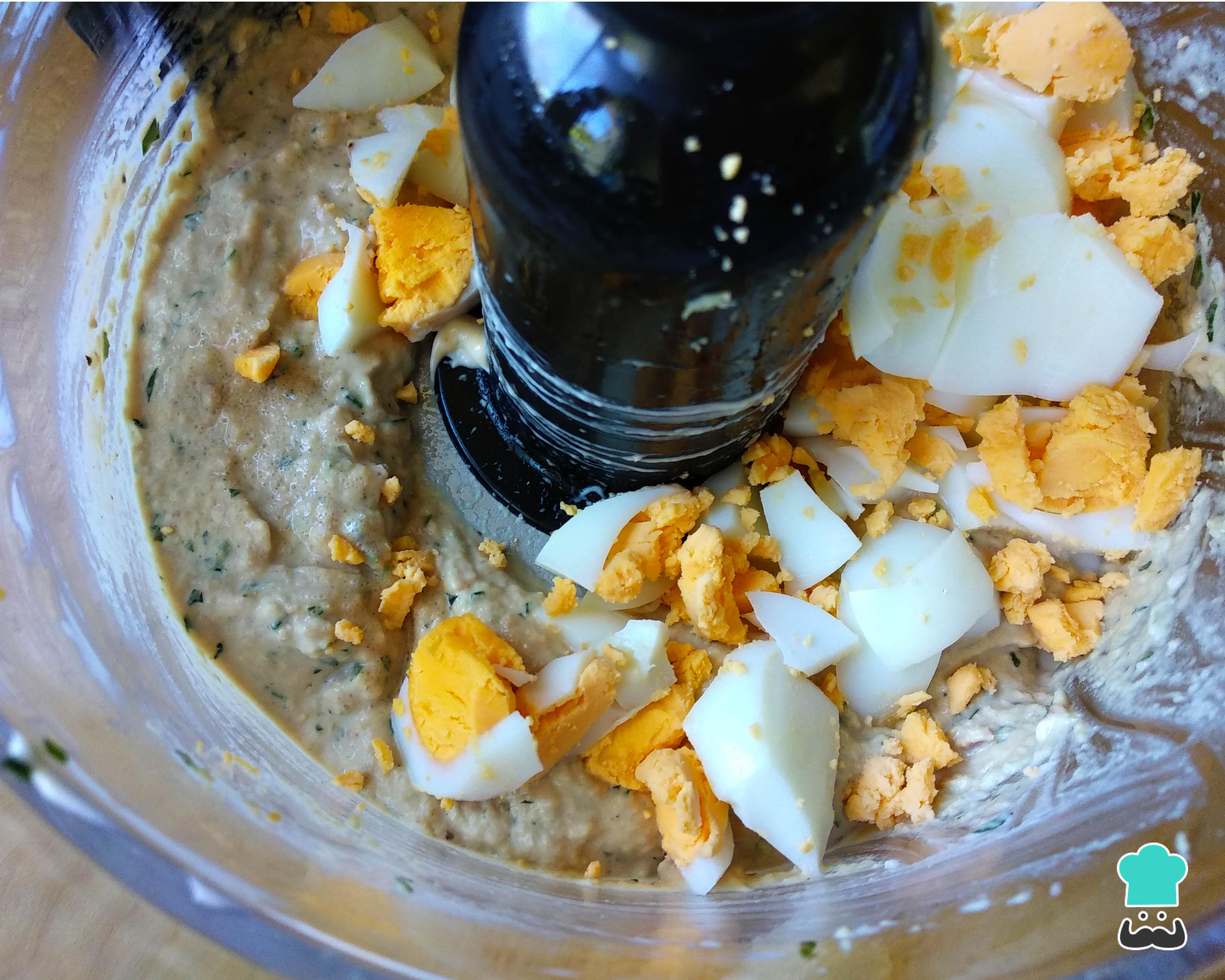 Como engrossar o patê de atum? Um truque válido é adicionar no patê 1-2 ovos cozidos e picados, como na foto. O ovo, além de melhorar o sabor do patê, ainda ajuda a conseguir um patê de atum consistente e nutritivo. Bata até processar o ovo.
