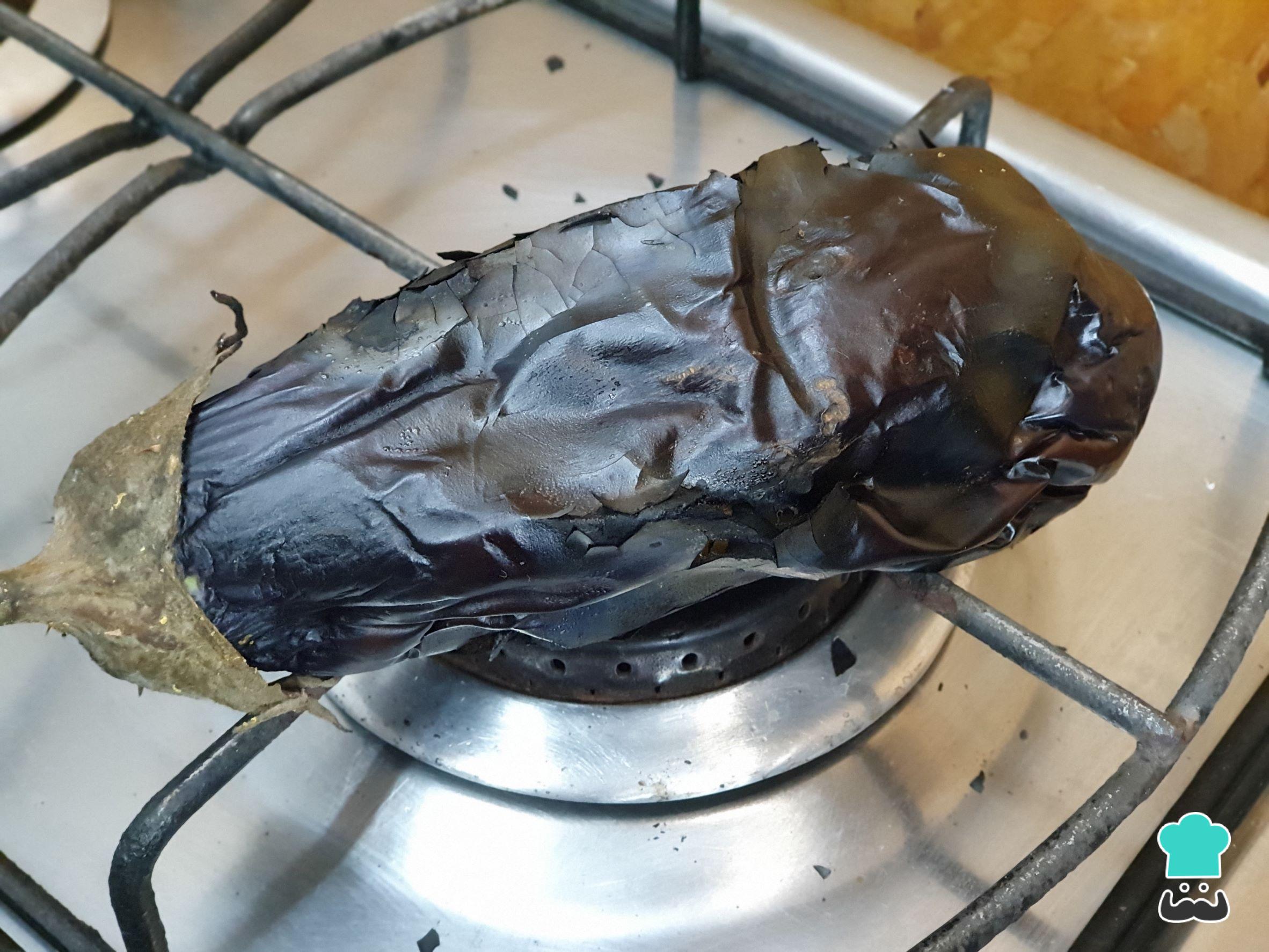 Leve a berinjela para a chama do fogão e queime todos os lados da casca, enquanto segura a berinjela com um garfo de churrasco. A polpa precisa estar bem macia por dentro. Desligue o fogo e reserve até que a berinjela esfrie.