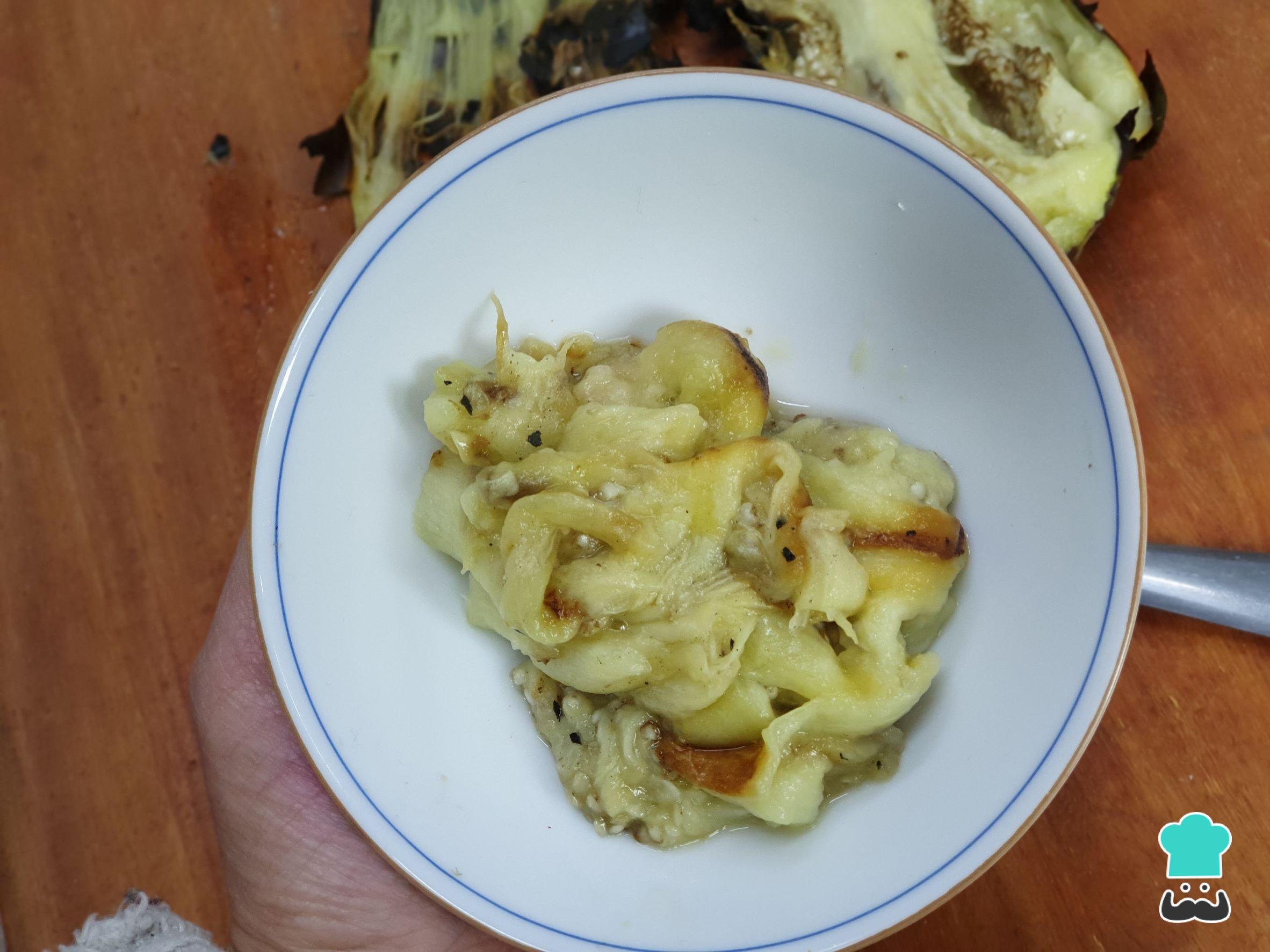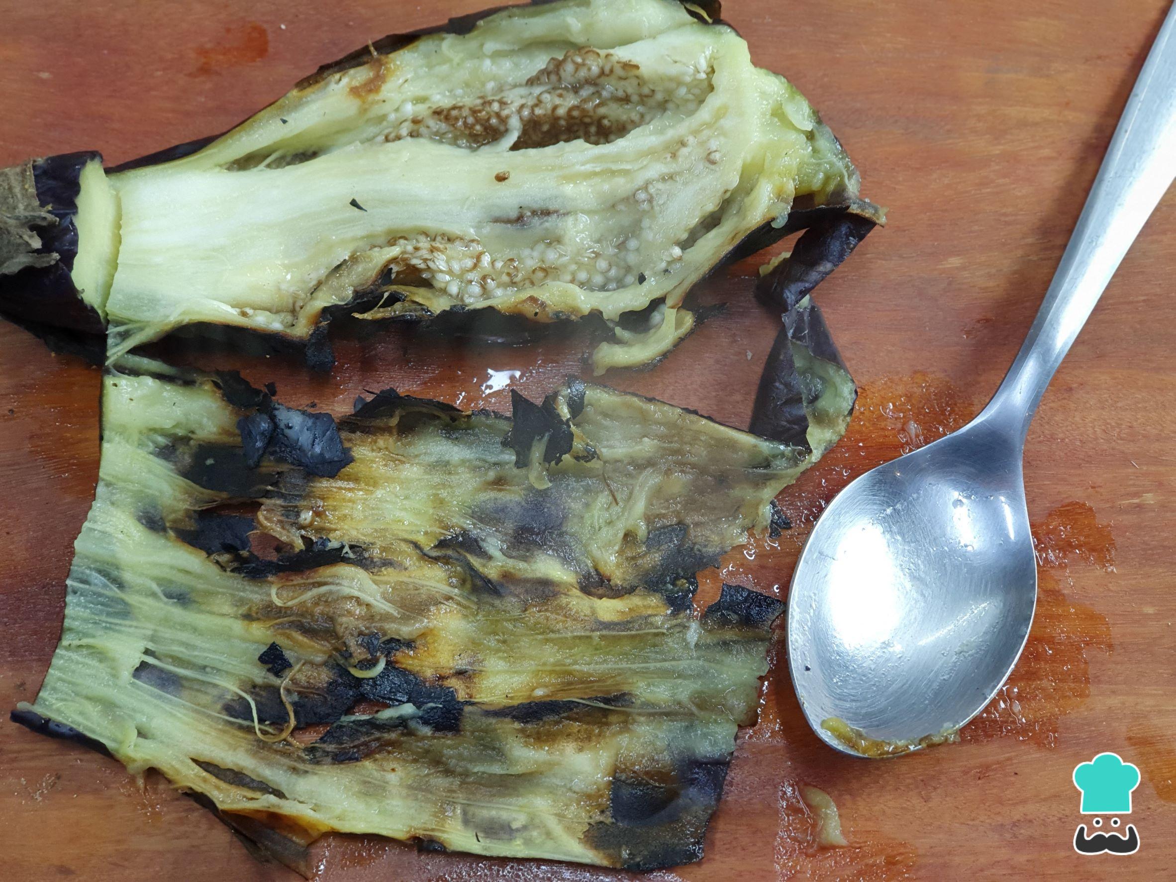 Abra delicadamente a berinjela e, com a ajuda de uma colher, remova toda a polpa da berinjela. Cuide para que não saiam partes da casca queimada junto com a polpa.