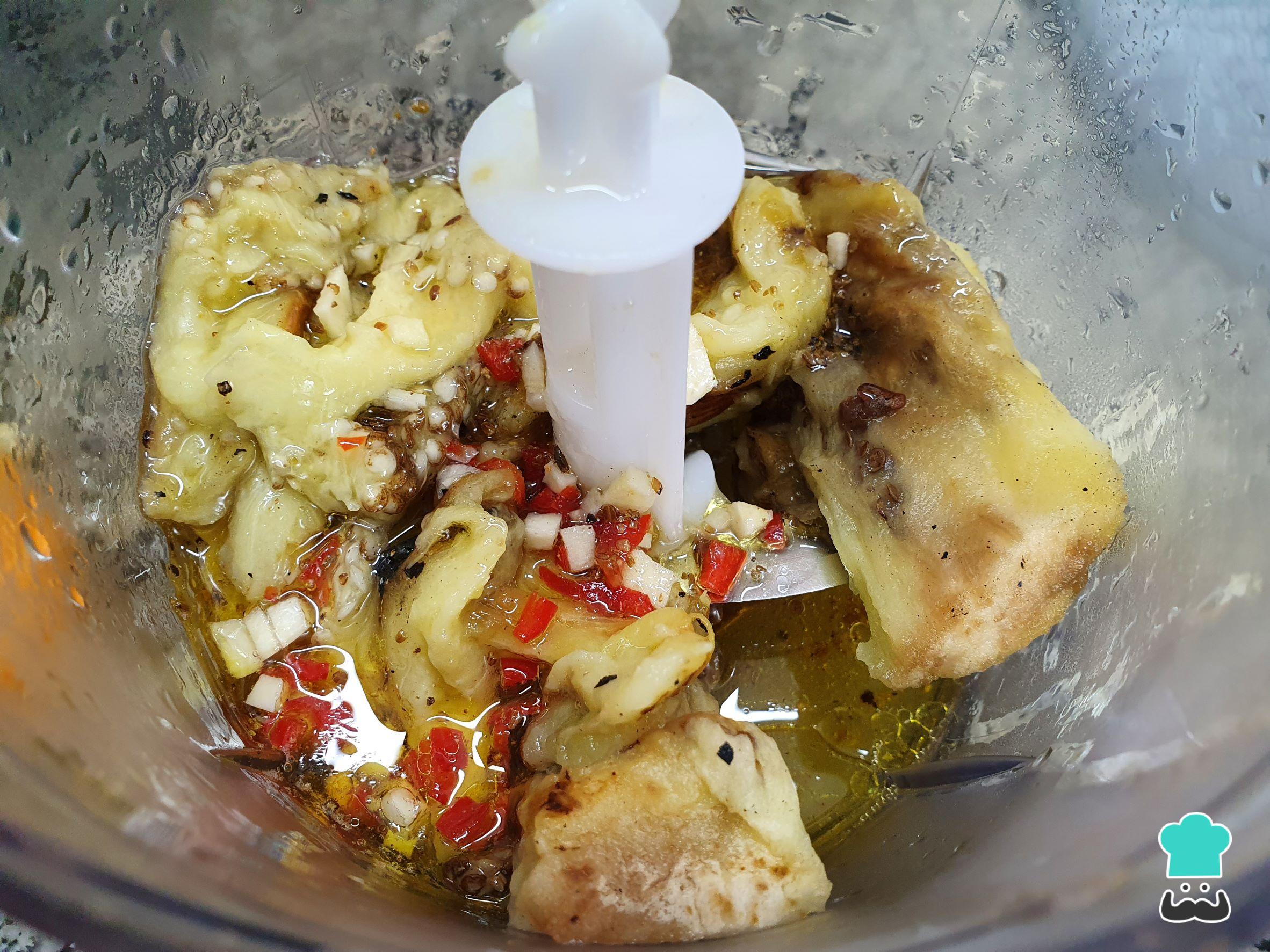 Agora junte a polpa da berinjela com a mistura de todos os temperos e bata em um processador até que forme uma pastinha. Neste momento, corrija o sal e finalize com cebolinha verde picada a gosto.