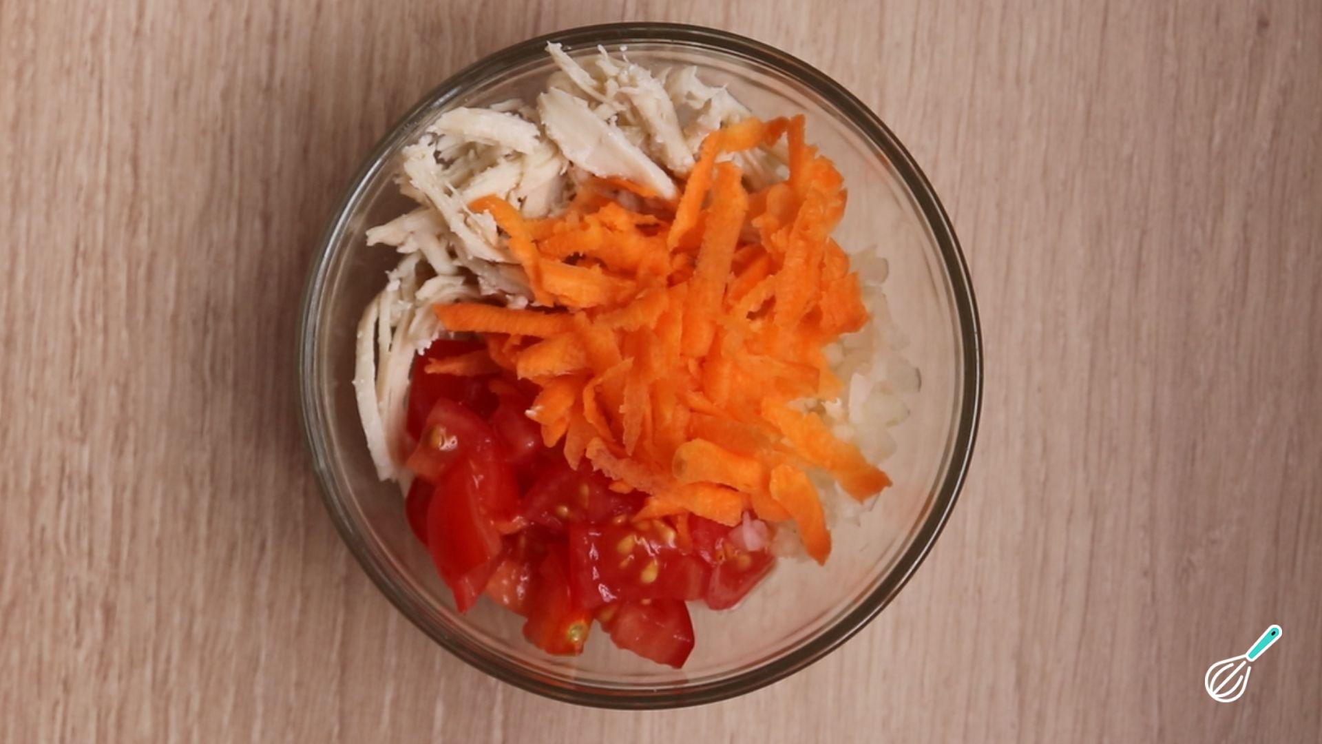 Comece fazendo o pré-preparo para o seu patê de frango com cenoura: descasque e rale a cenoura, pique a cebola, corte o tomate em cubos e cozinhe e desfie o frango.