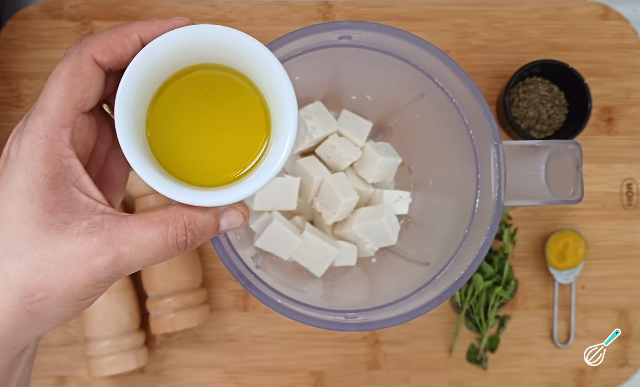 No liquidificador, adicione o leite, a ricota fresca picada e o azeite de oliva.
