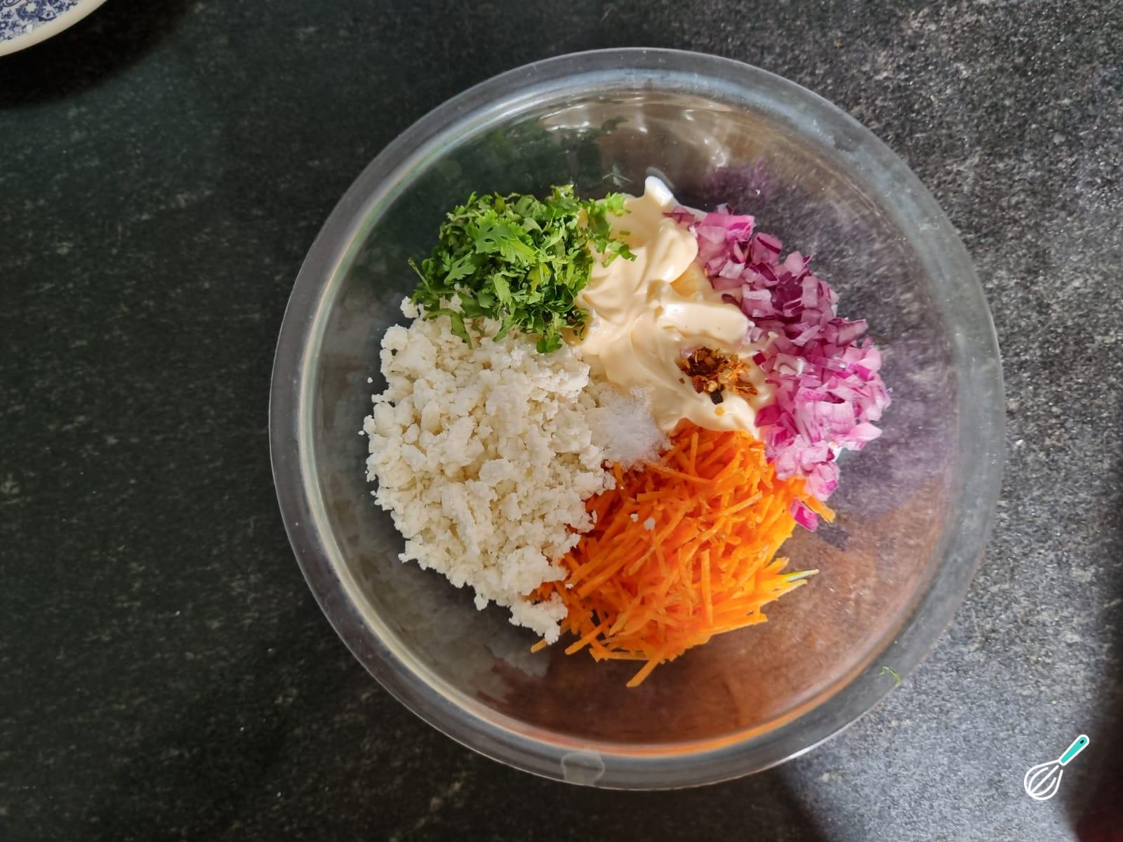 Numa tigela de vidro média ou grande, coloque a ricota, a cenoura, a maionese, o coentro ou salsinha, o sal e a pimenta e com a ajuda de uma colher ou espátula misture bem, até incorporar totalmente os ingredientes.