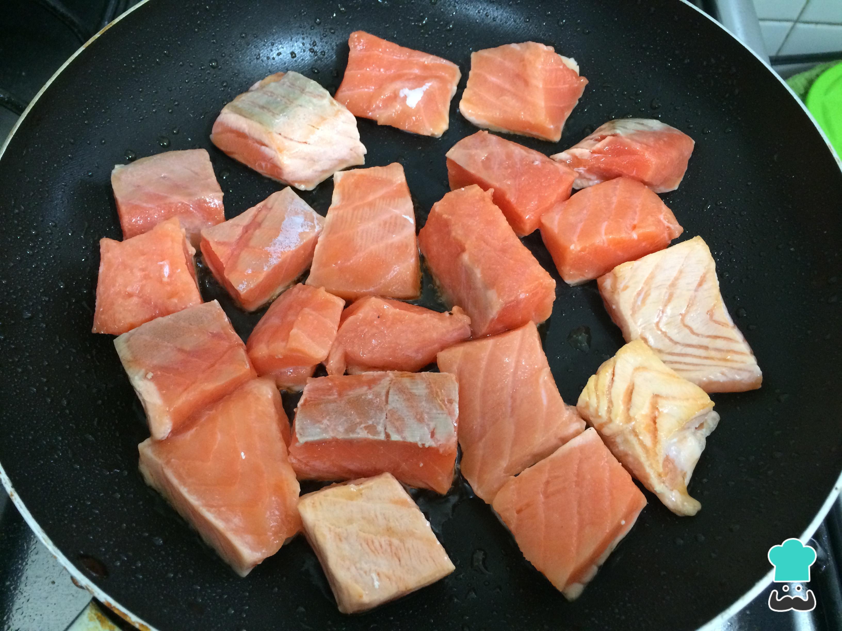 Em uma frigideira em fogo médio-baixo com óleo, adicione o salmão cortado em cubos e cozinhe por 3-5 minutos, ou até ficar dourado.