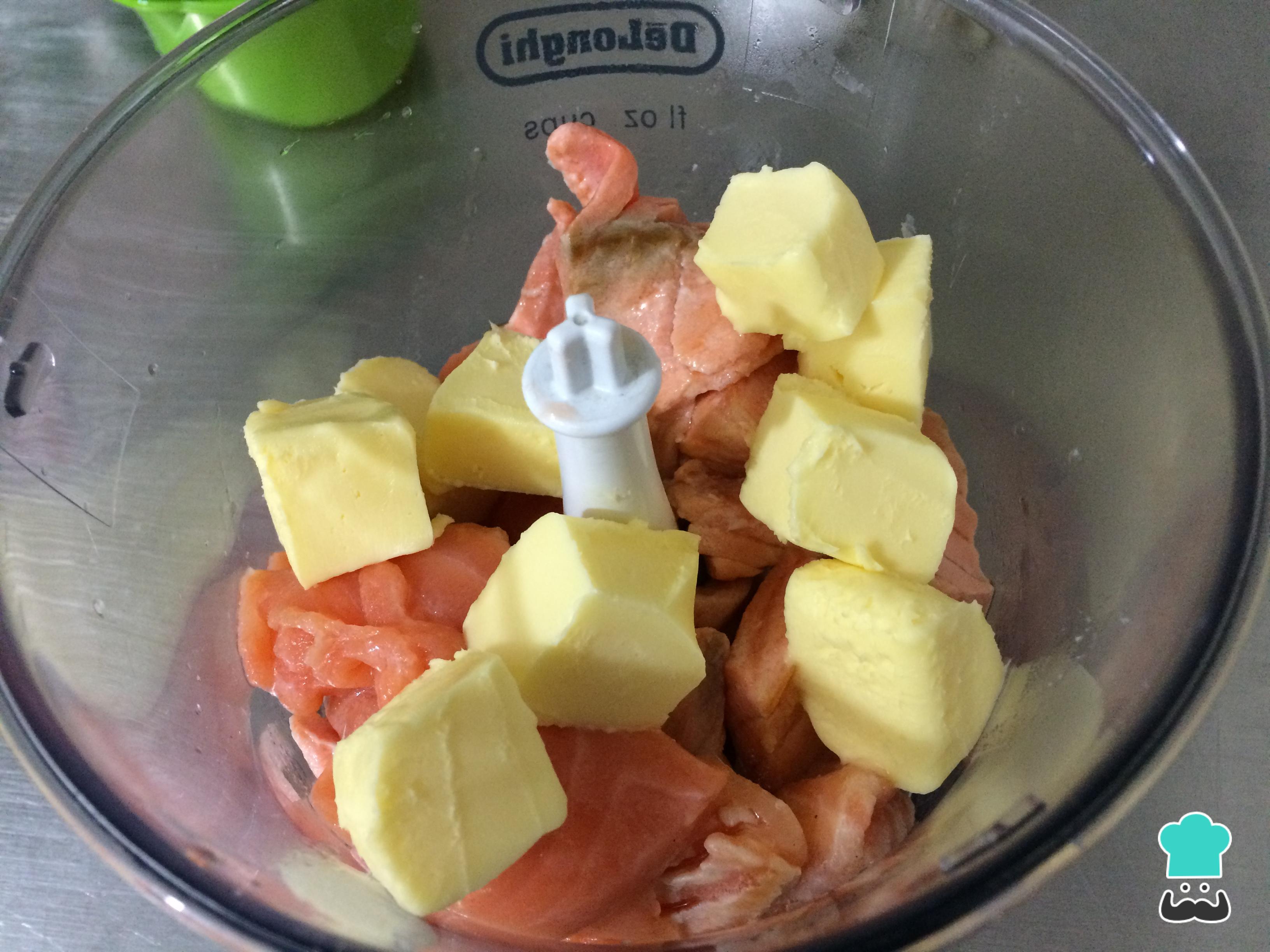 Após o tempo indicado, e mesmo que o salmão ainda esteja cru, retire e coloque em um processador junto com a manteiga cortada em cubos. Bata até virar uma pasta homogênea.