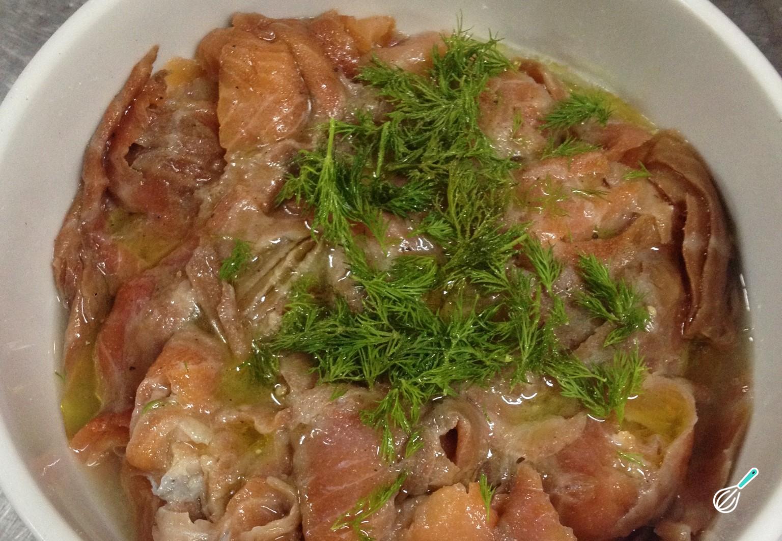 Antes de mais, recomendamos que reúna todos os ingredientes necessários. Lembre-se de que, como é uma receita de aproveitamento, o ideal é usar os restos de um outro prato. Se o que resta é salmão fresco, você pode defumá-lo você mesmo. Para saber como defumar salmão, siga a receita de salmão defumado.