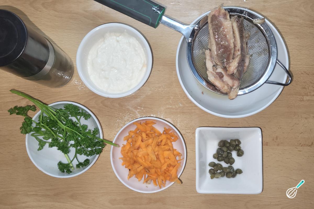 Separe os ingredientes para fazer seu patê de sardinha com requeijão. Para esse patê, gosto de usar alcaparras, que trazem um salgadinho que combina muito bem com a sardinha. Se não gostar ou não tiver, também fica perfeito com azeitonas verdes ou pretas.