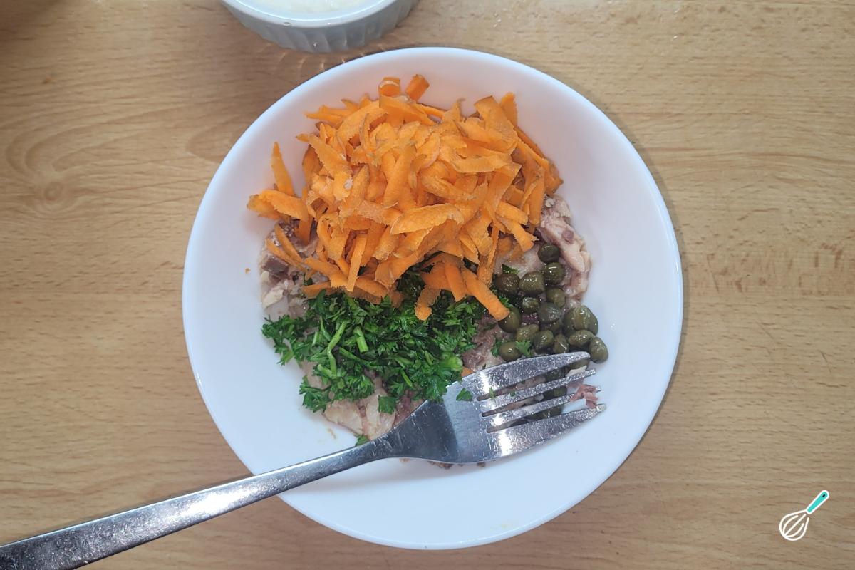 Junte a cenoura ralada, a salsinha picadinha e as alcaparras ou azeitonas picadas.