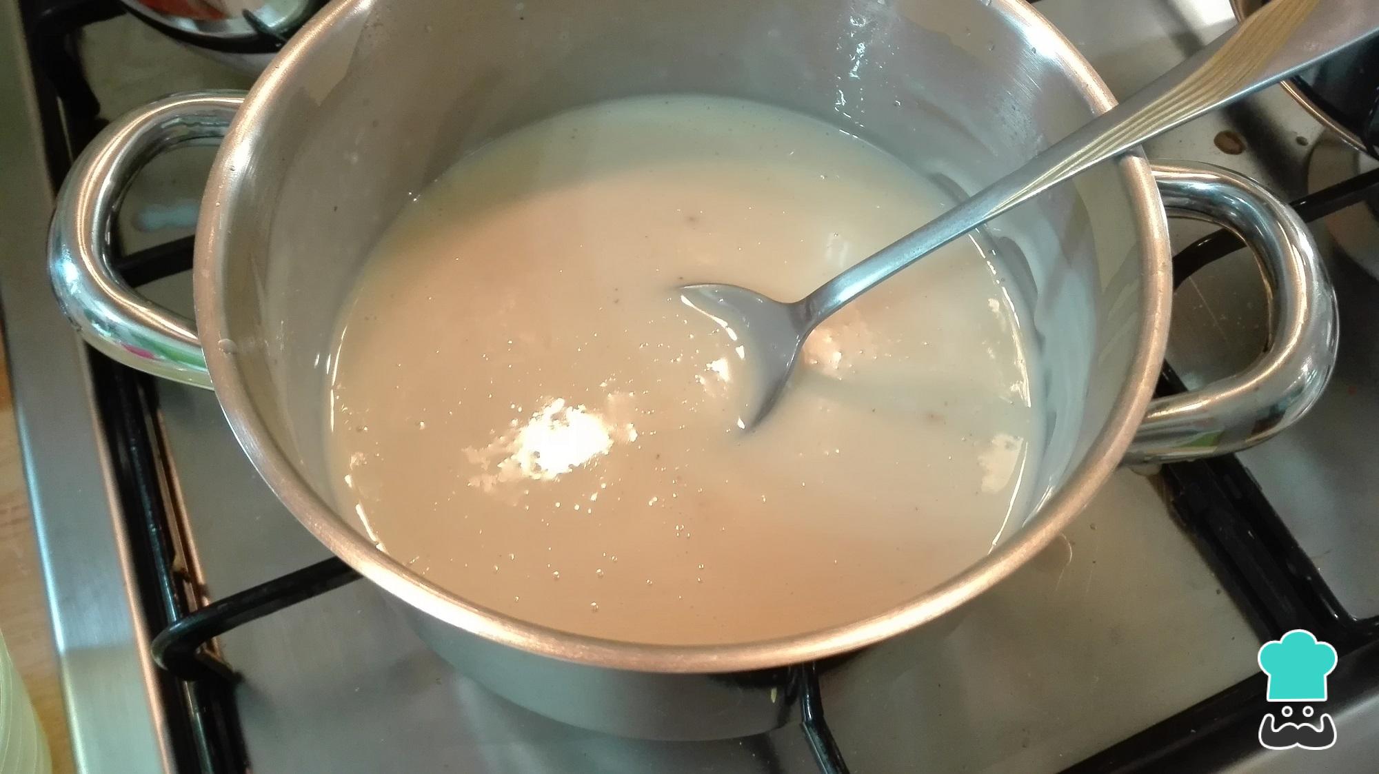 Para fazer o creme branco, dissolva a maisena no leite, e coloque em uma panela junto com o leite condensado e as gemas. Fique mexendo em fogo médio por 15-20 minutos, ou até engrossar.