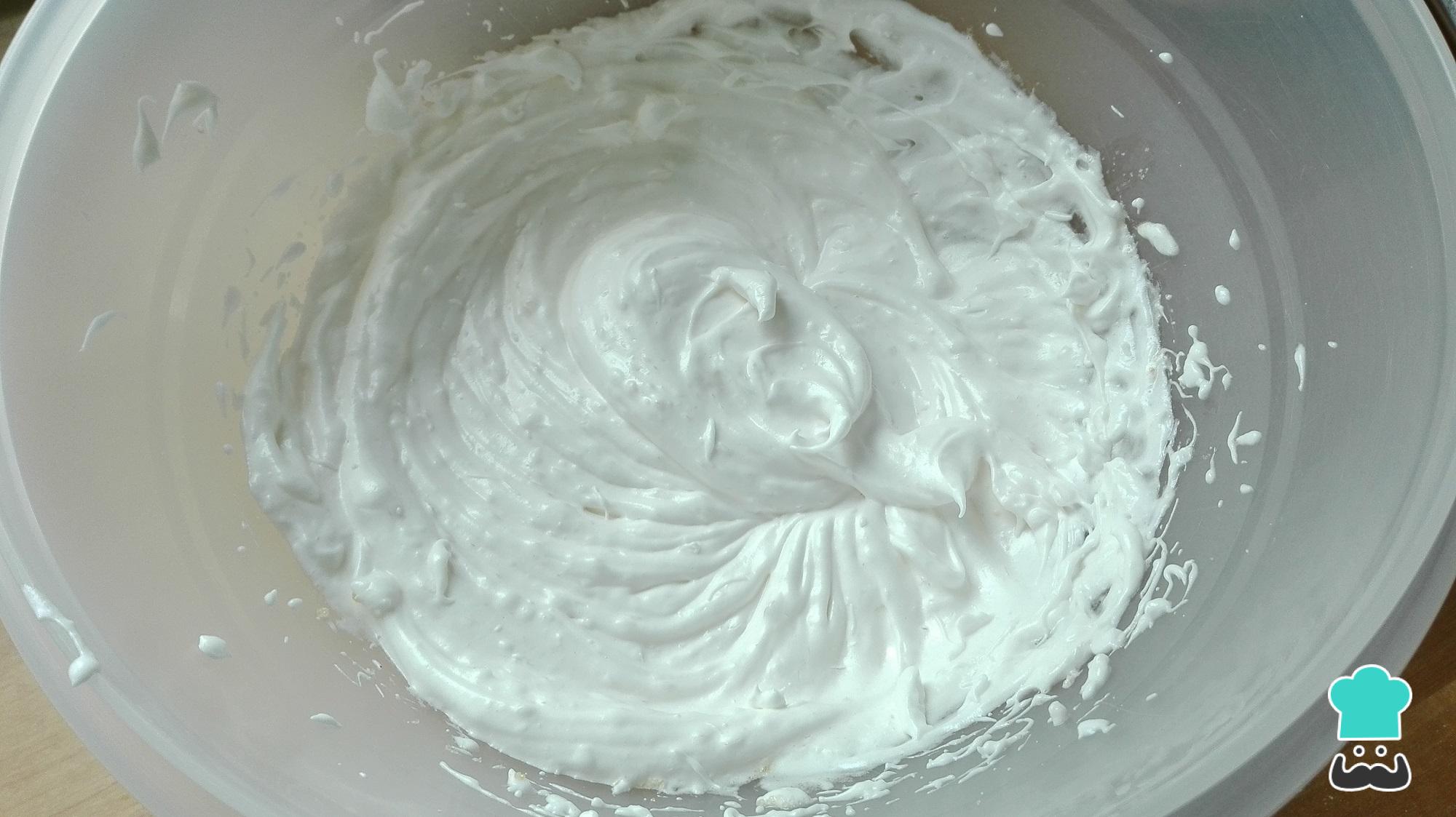 Para a cobertura, bata as claras com o açúcar e o sal, e espalhe sobre o pavê. Decore com biscoito champanhe moído e um pouco de abacaxi.
