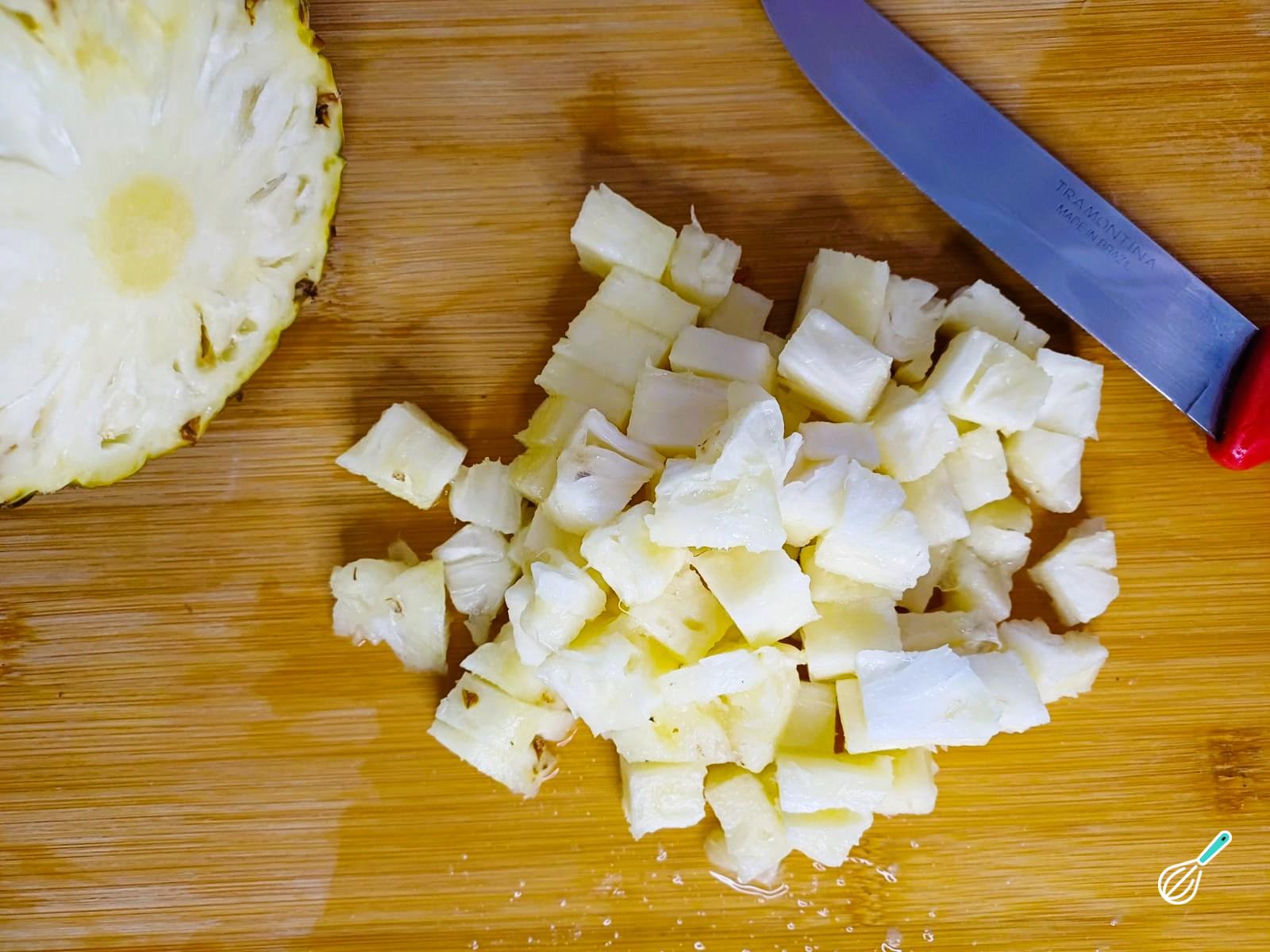 Comece descascando e cortando o abacaxi em cubos pequenos, dispensando o caroço duro do meio.