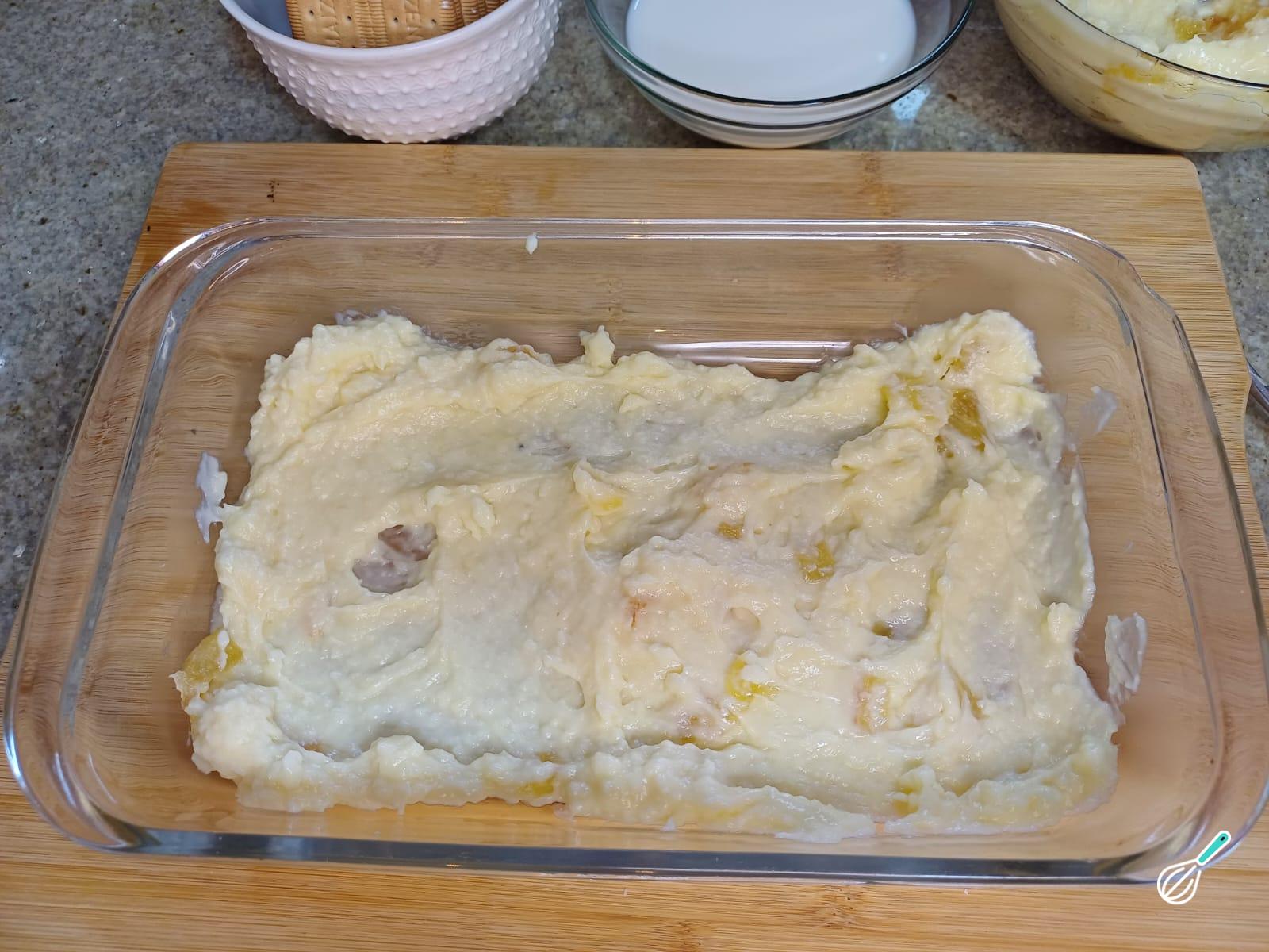 Para montar o pavê: em uma travessa média espalhe uma camada generosa do creme com o abacaxi.