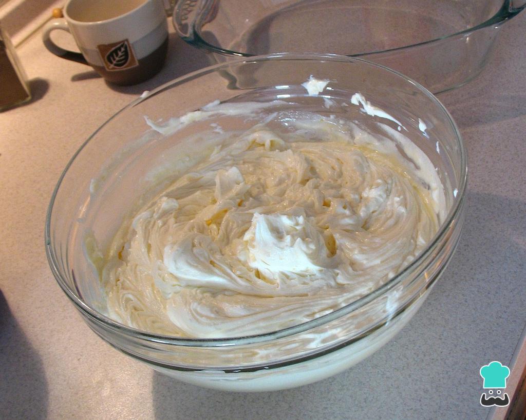 O primeiro passo dessa receita de pavê de ameixa é preparar o creme de marcarpone. Para isso coloque o mascarpone e o creme de leite em uma tigela e bata com o batedor em velocidade baixa, apenas para misturar até ficar homogêneo.