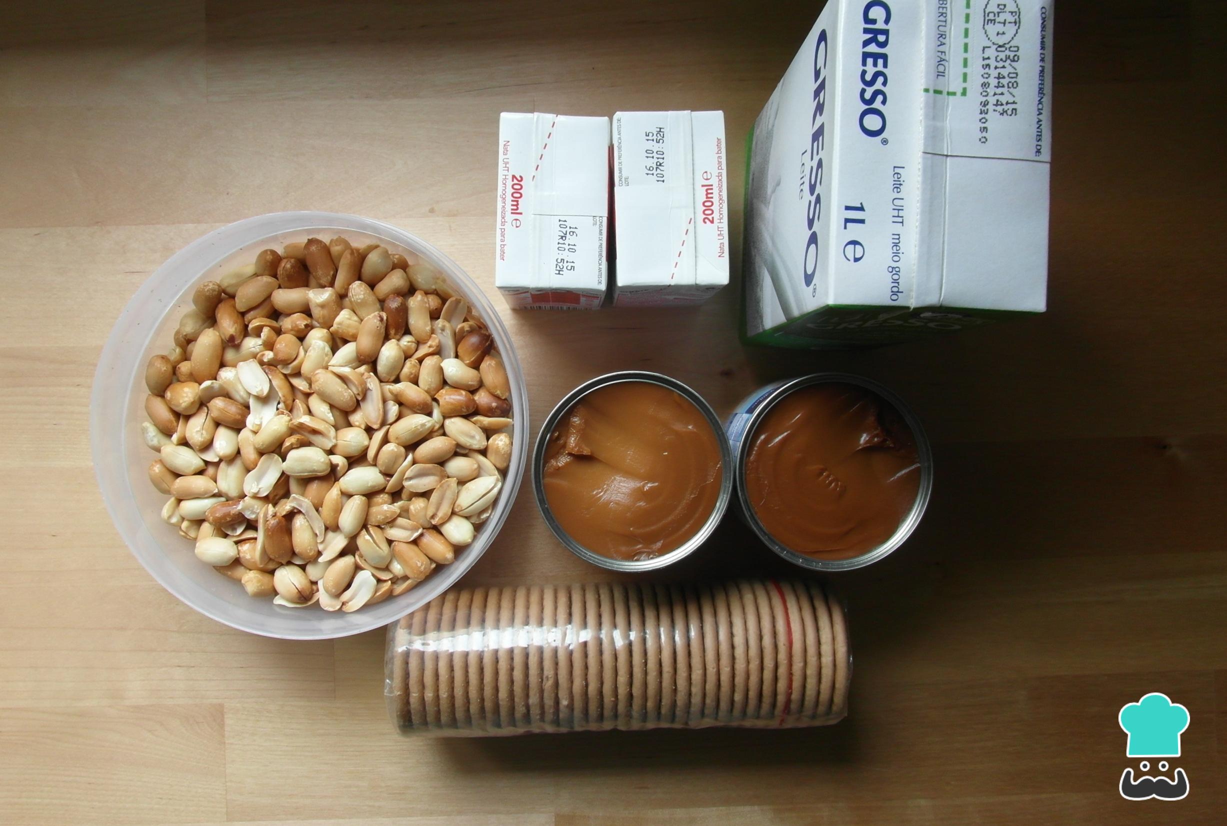 Para preparar esta receita de pavê de amendoim com doce de leite comece por reunir os ingredientes.
