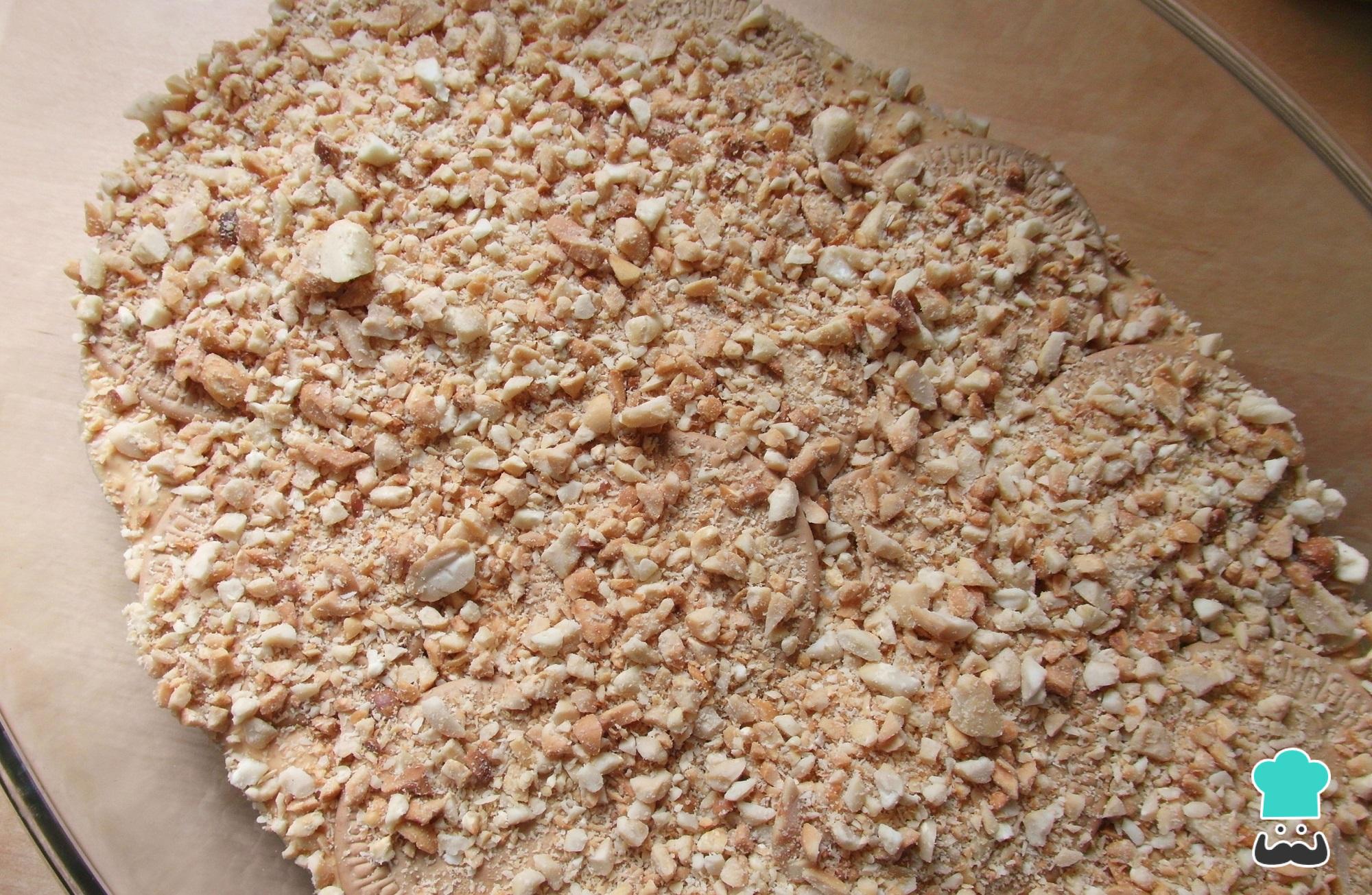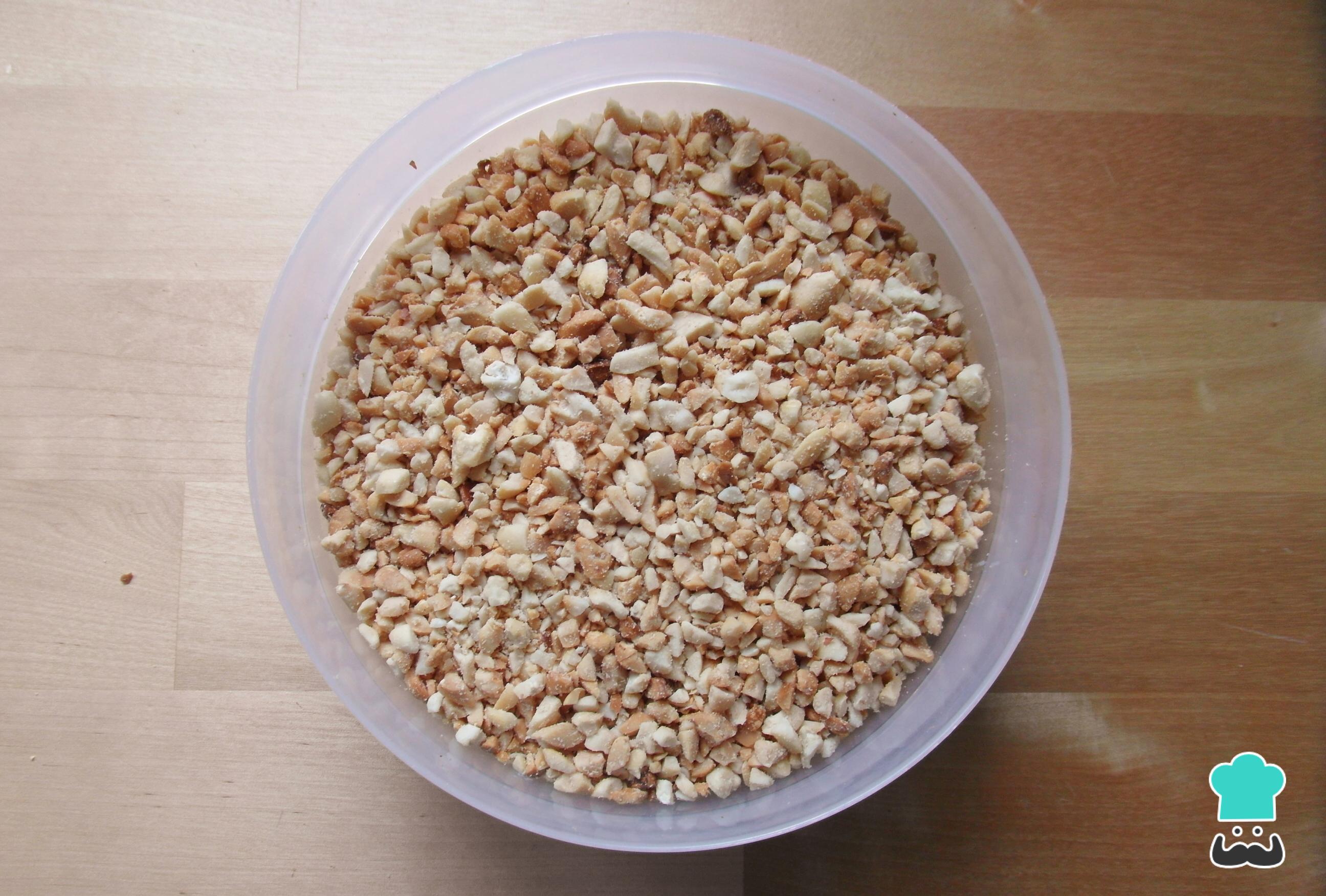 Continue preparando esta receita de pavê de amendoim com doce de leite: triture os amendoins até ficarem em pedaços pequenos.
