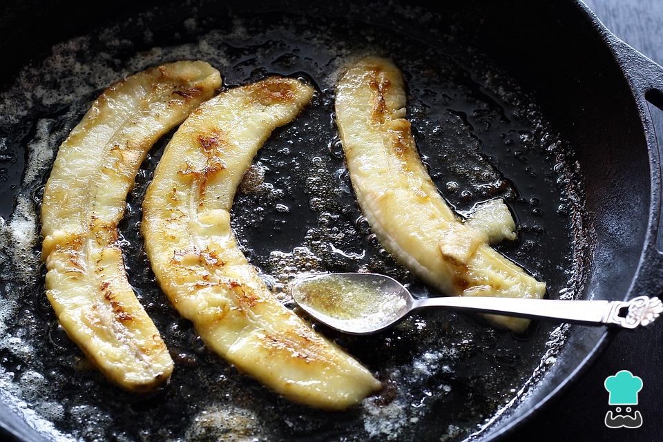O primeiro passo desse pavê de banana e caramelo é caramelar as bananas. Leve ao fogo médio-baixo uma frigideira ou panela com o açúcar e 2 colheres de água e deixe derreter. Adicione as bananas descascadas e cortadas ao comprido e cozinhe até que fiquem douradas, Desligue e deixe esfriar.