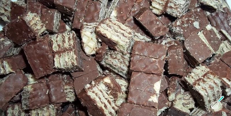 Comece preparando seu pavê de bis reservando 6 barrinhas de Bis para decoração no final e picando as restantes.