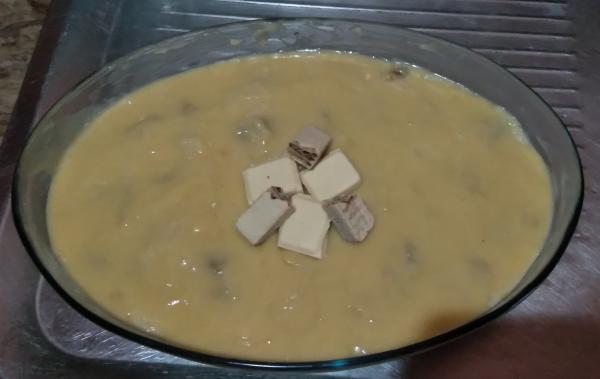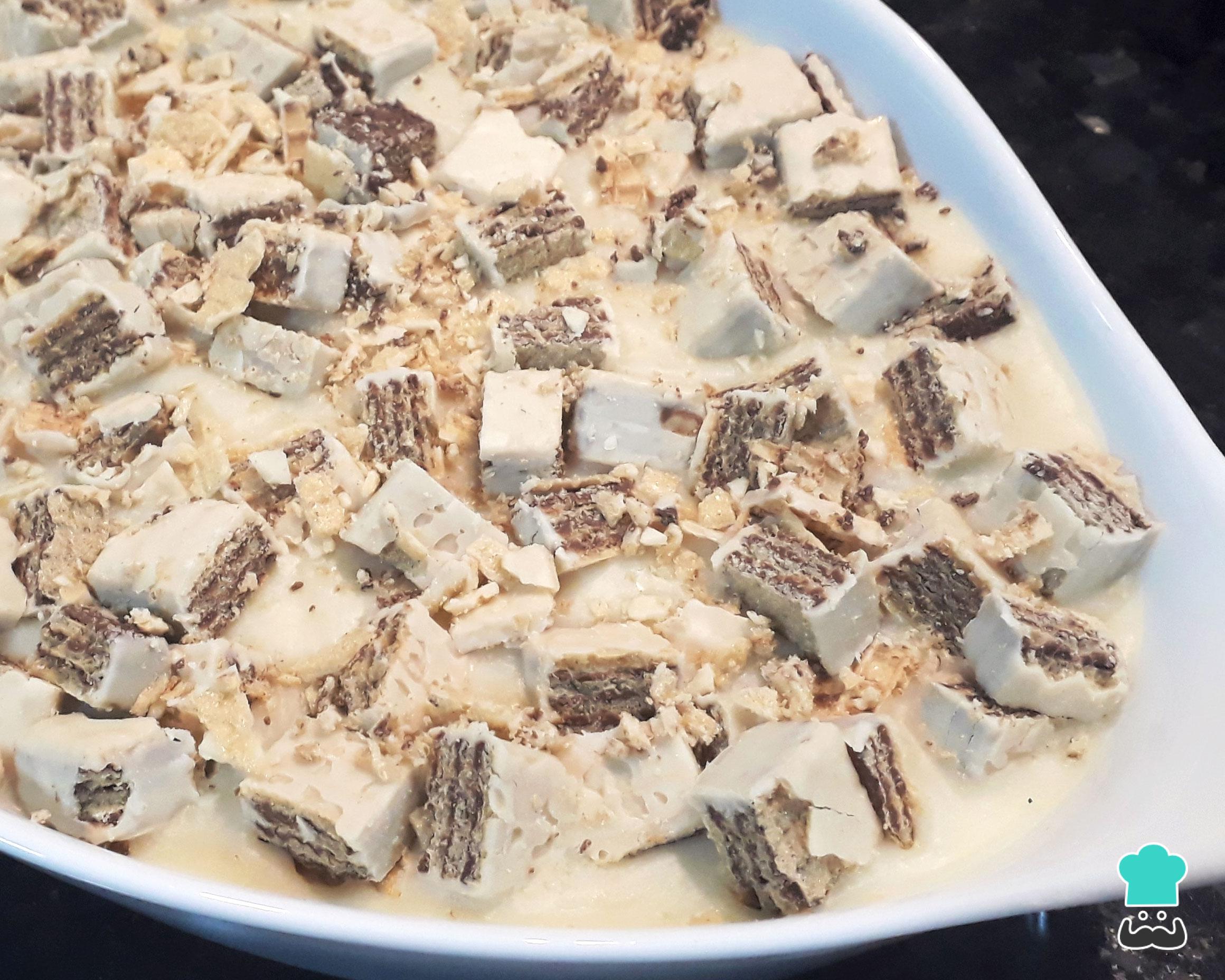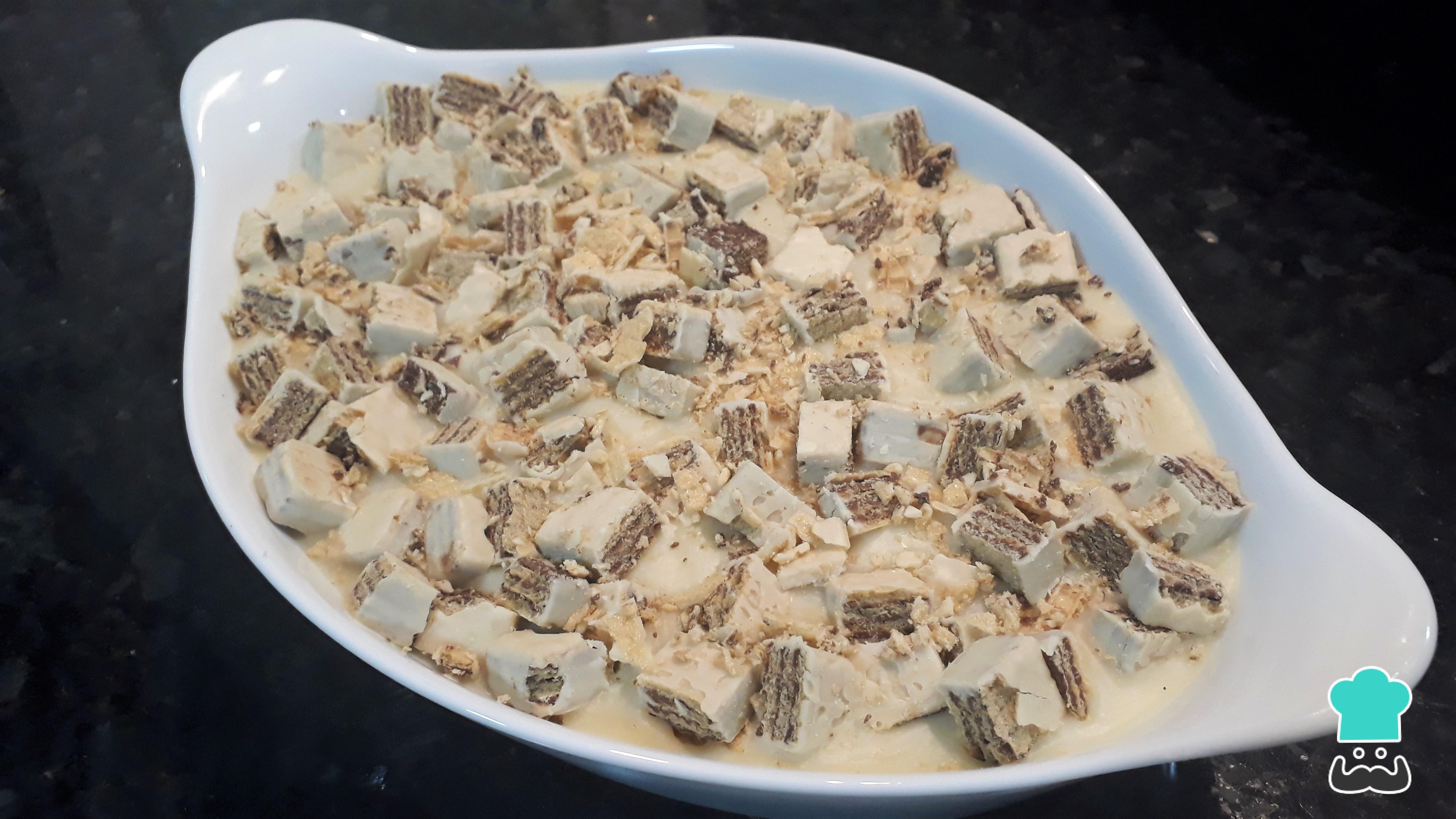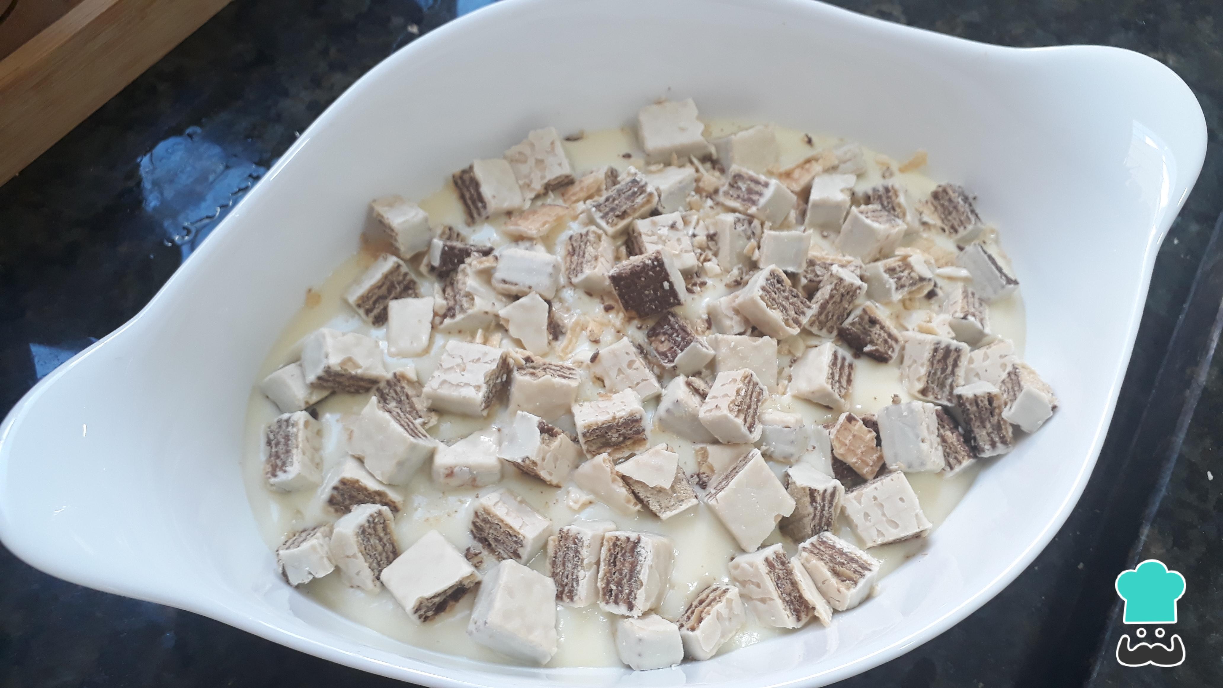 Em um refratário, coloque metade do creme preparado no passo 1 e metade do Bis picado, como mostra a imagem.