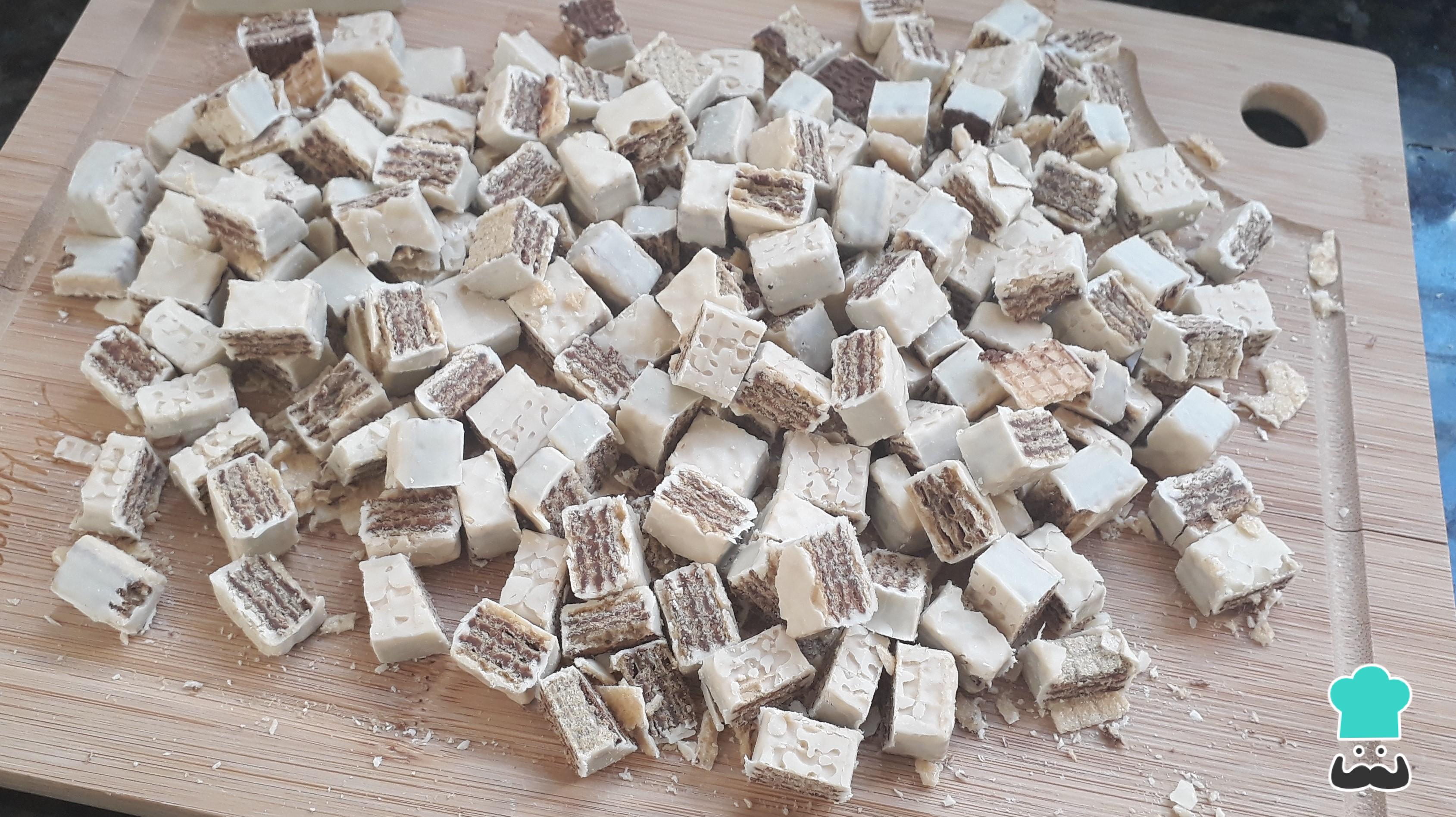 Retire as unidades de Bis da embalagem e pique em quadradinhos, como mostra a imagem.