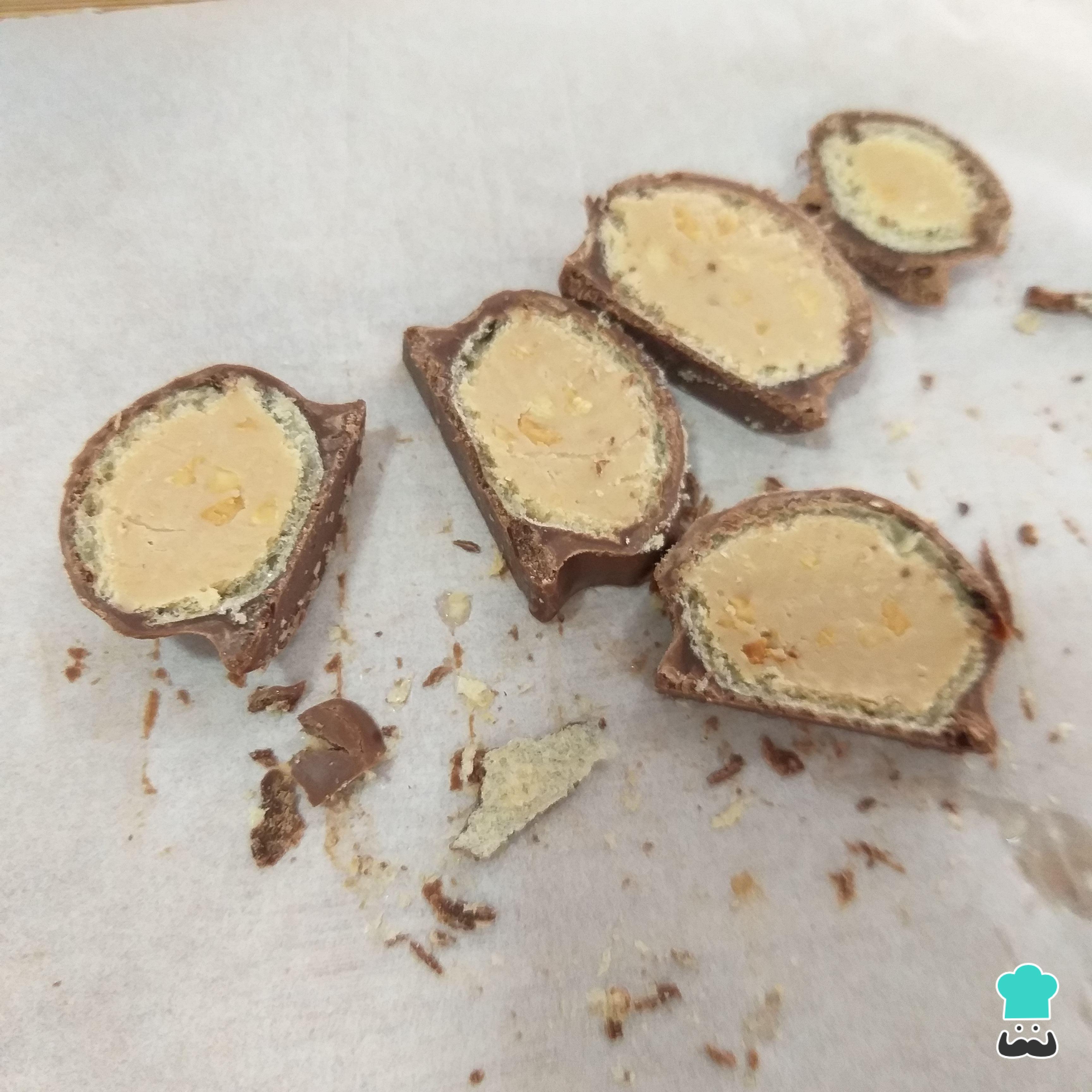 Corte os bombons Sonho de Valsa em fatias e reserve. Eles serão usados na montagem e na decoração desta sobremesa de Páscoa.