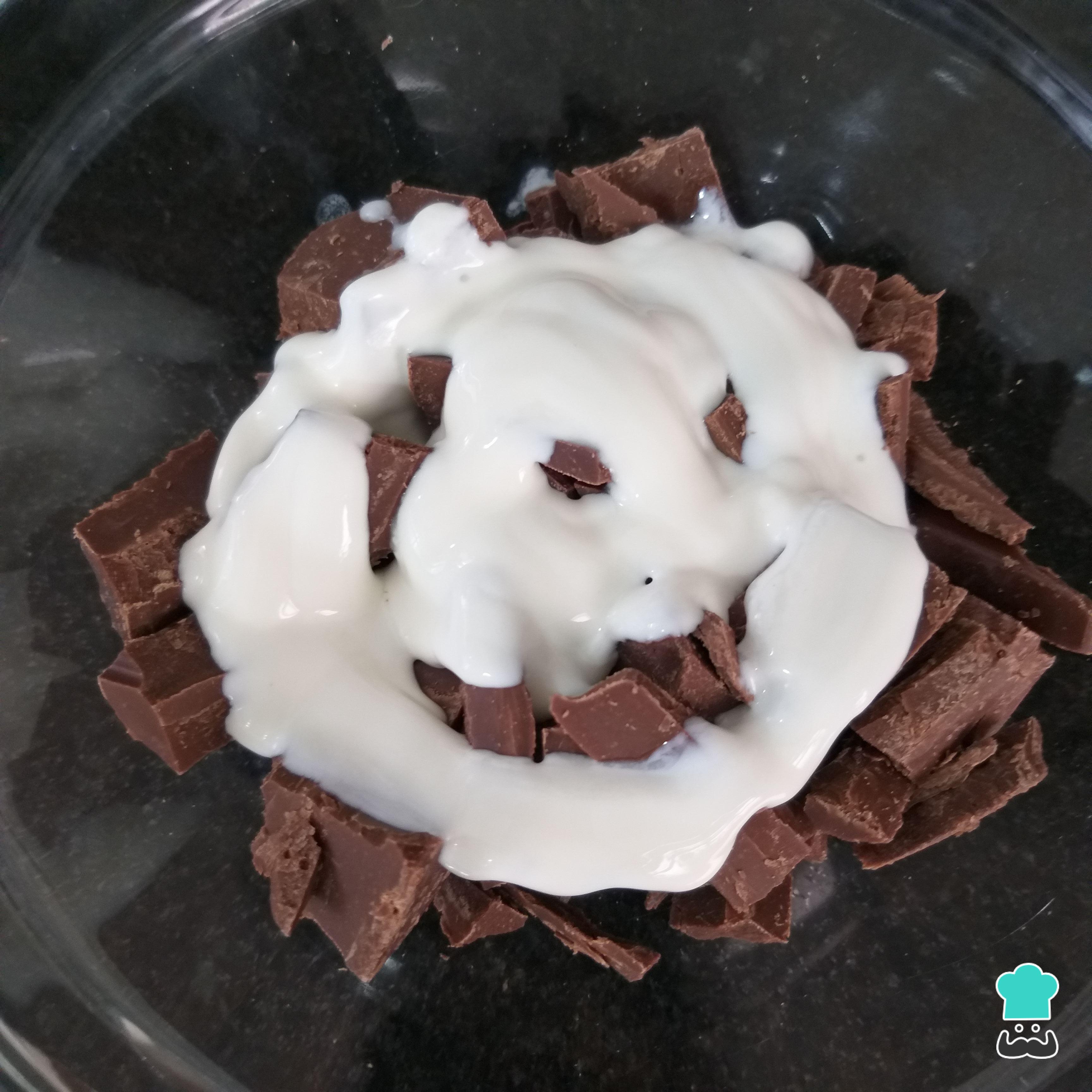 Leve 100 g do chocolate picado e o restante do creme de leite ao microondas em potência alta por 30 segundos. Mexa e devolva ao microondas por mais 2 vezes, com 15 segundos de tempo cada vez. Desse jeito conseguirá uma ganache de chocolate.