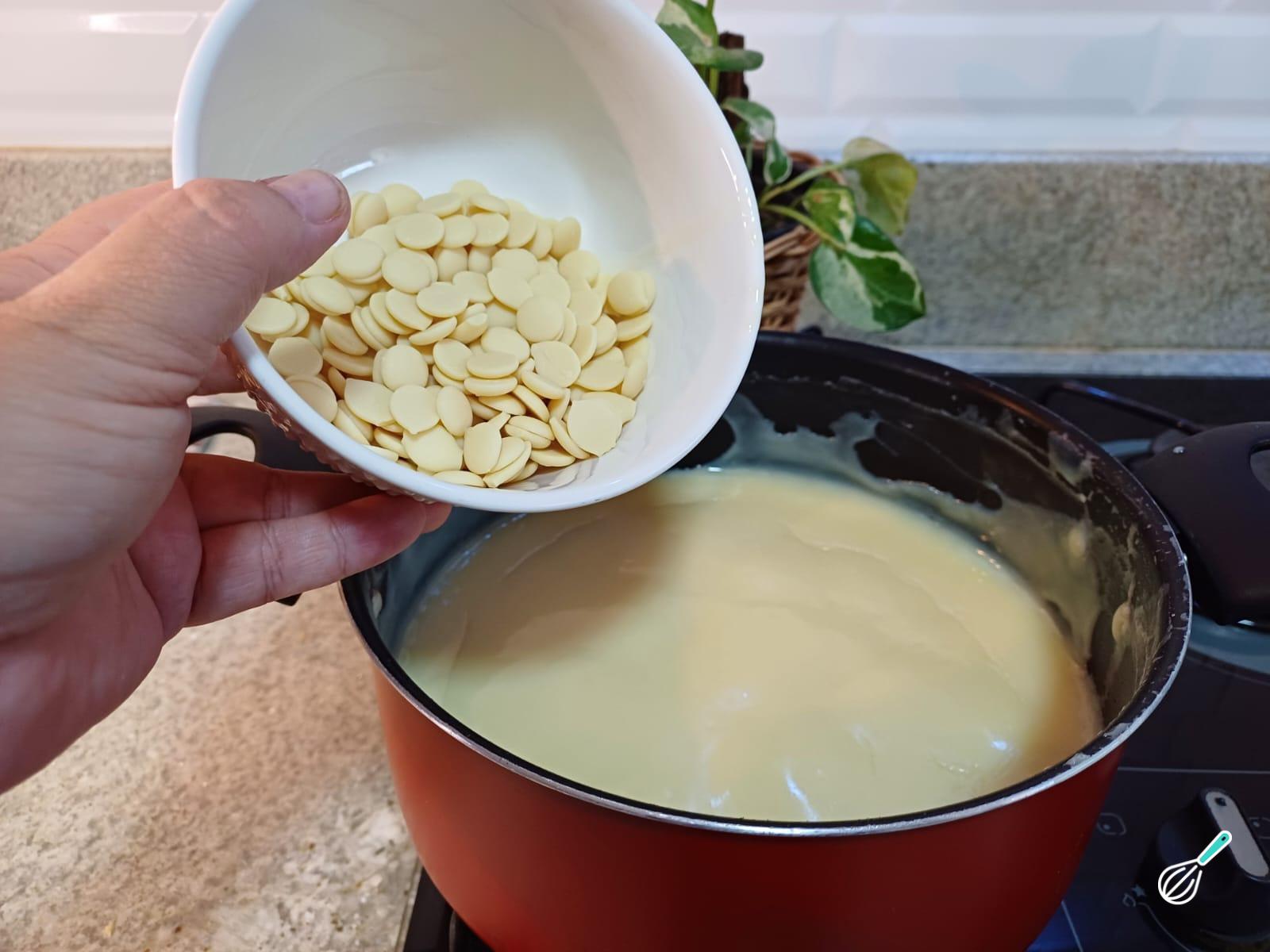 Adicione o chocolate branco picado ou em gotas e misture até derreter completamente e obter um creme liso e espesso. Desligue o fogo e transfira o creme para um refratário. Reserve.