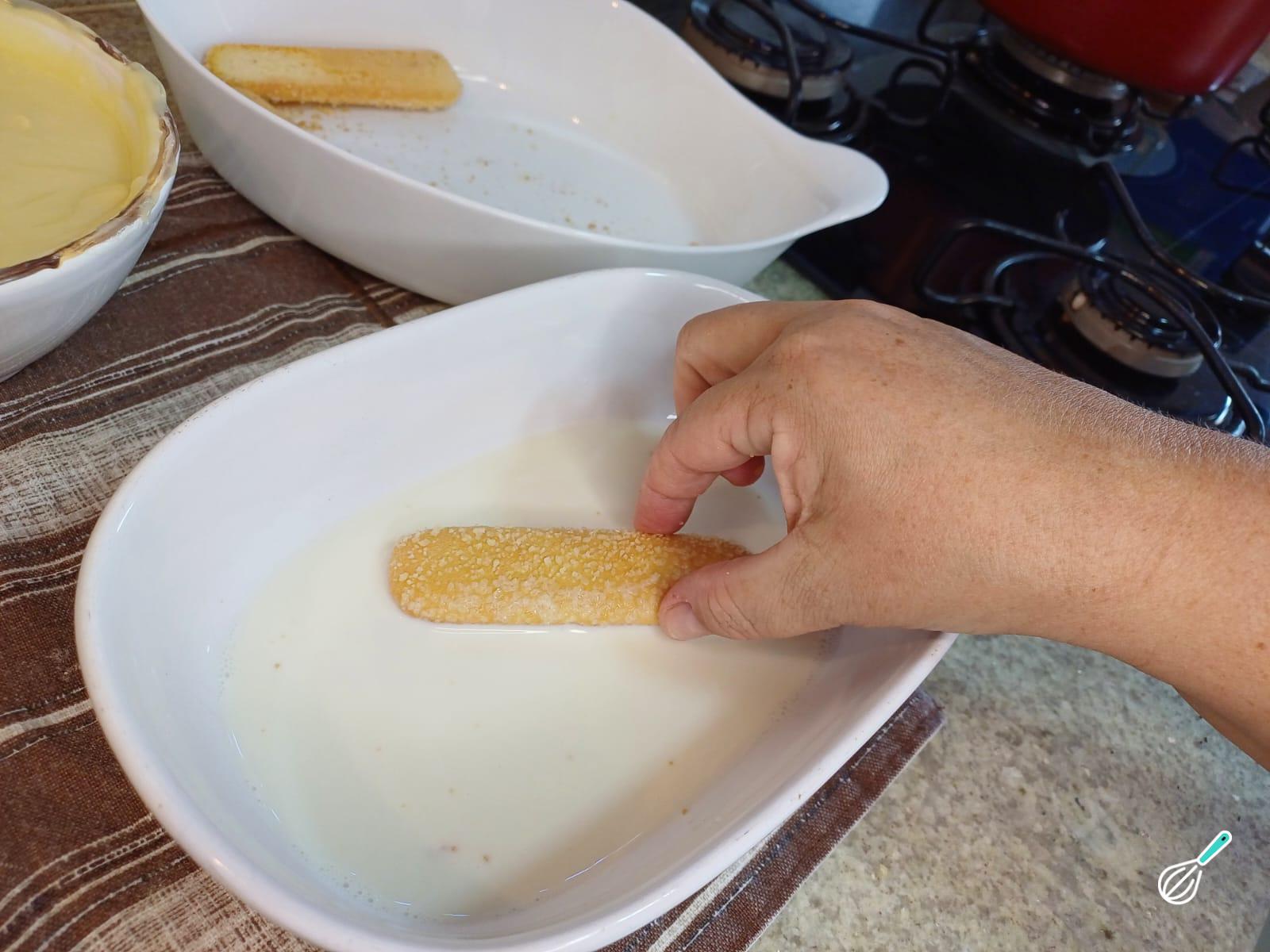 Preparar as bolachas: coloque o leite em um recipiente médio, e umedeça as bolachas.
