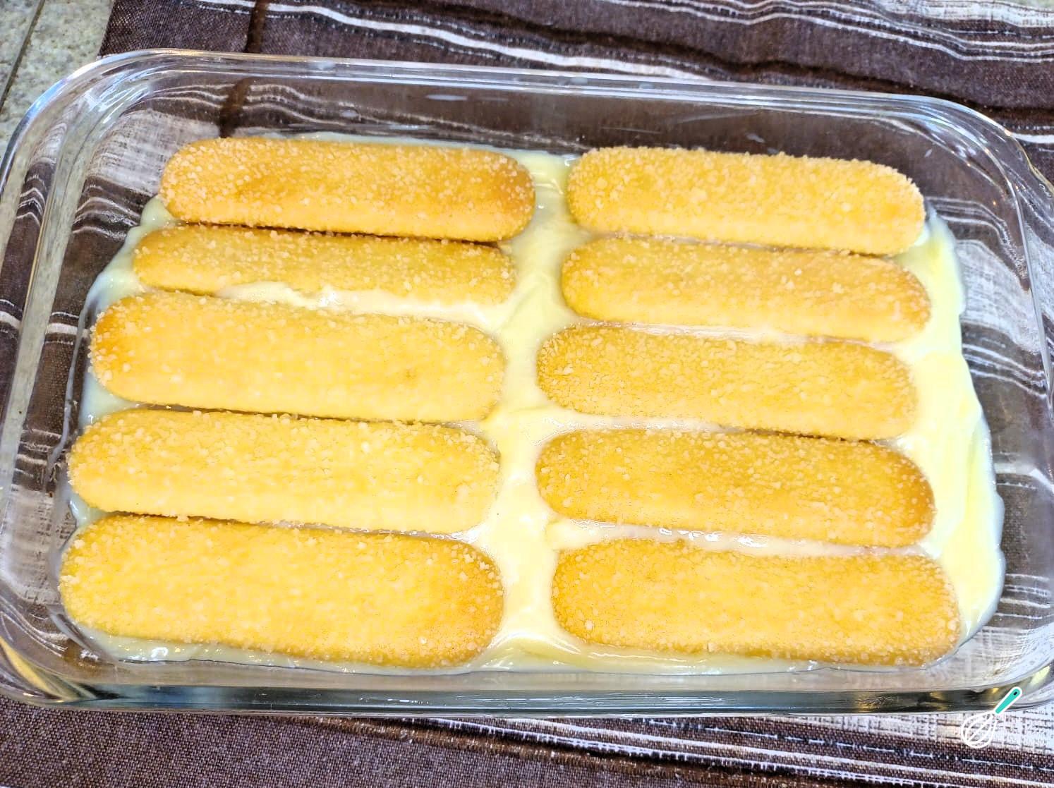 Para a montagem do pavê, em um recipiente de vidro ou cerâmica, comece a montagem com uma camada de bolacha champanhe umedecida. Cubra com uma camada generosa de creme de chocolate branco. Adicione mais uma camada de bolacha umedecida.
