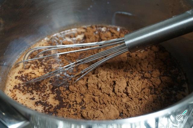 Ao leite que está na panela adicione o açúcar, o cacau ou chocolate em pó e a essência de baunilha.