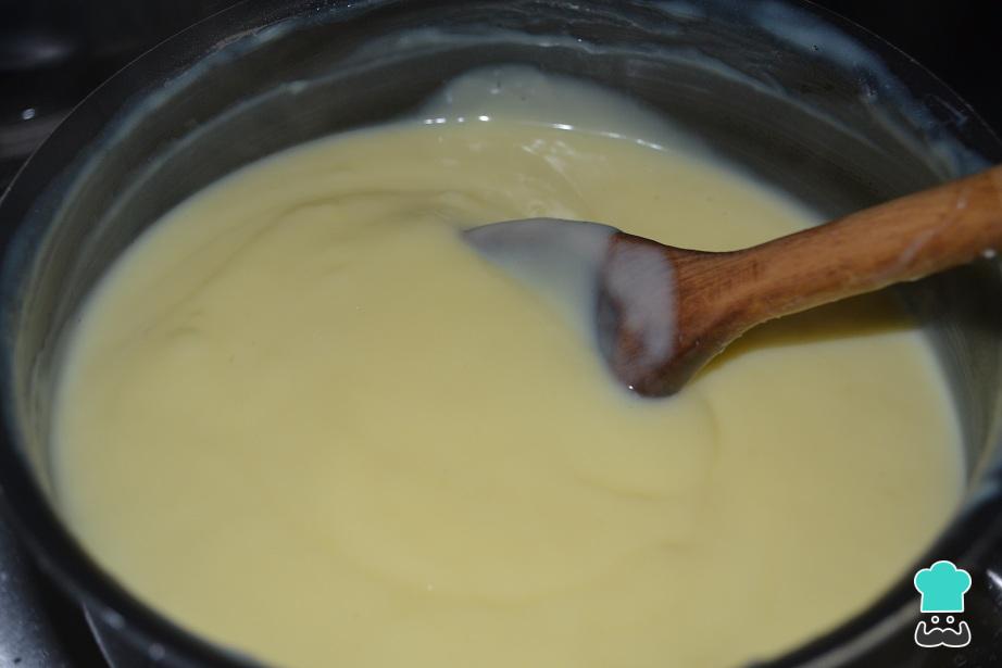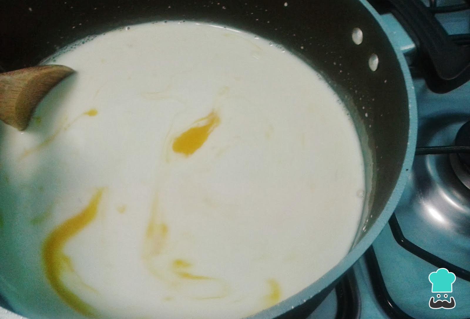 O primeiro passo desta receita de pavê é preparar o creme branco. Para isso dissolva a farinha ou maisena no leite desnatado e coloque em uma panela junto com o leite condensado, as gemas levemente batidas e a essência de baunilha. Leve ao fogo médio.