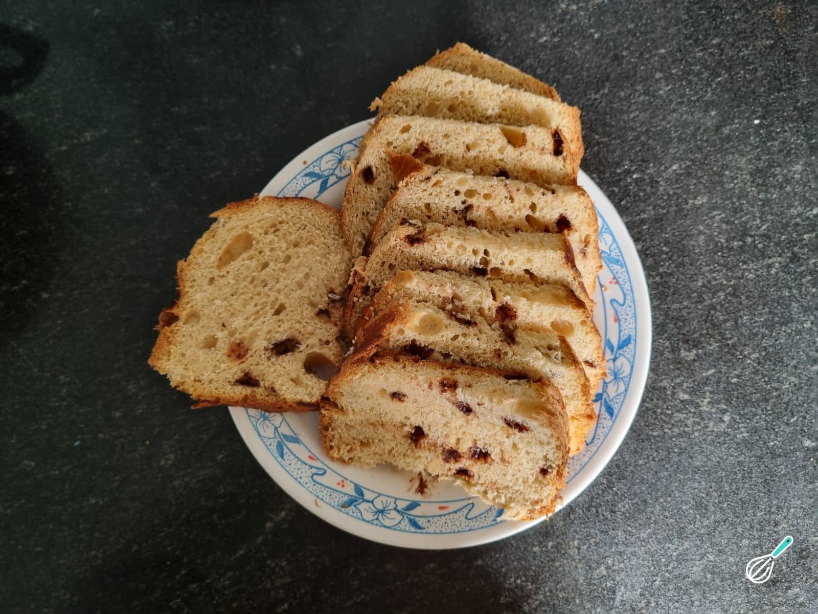 Cortei o chocotone no sentido da altura dele, de cima para baixo, porque ia servir numa travessa quadrada, mas se você pretende servir numa forma redonda basta fatiar ele deitado, e terá fatias redondas.