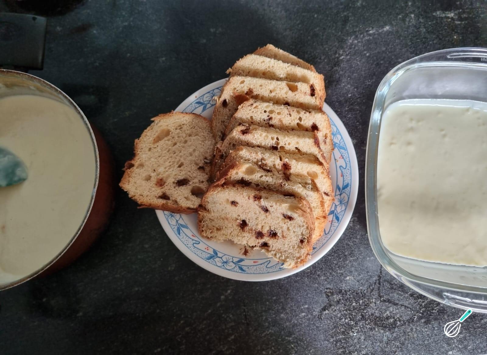 Separe todos os ingredientes nas quantidades descritas, corte o chocotone em fatias normais, não muito finas se atentando ao modo como vai servir, corte de modo que ele sirva no recipiente.