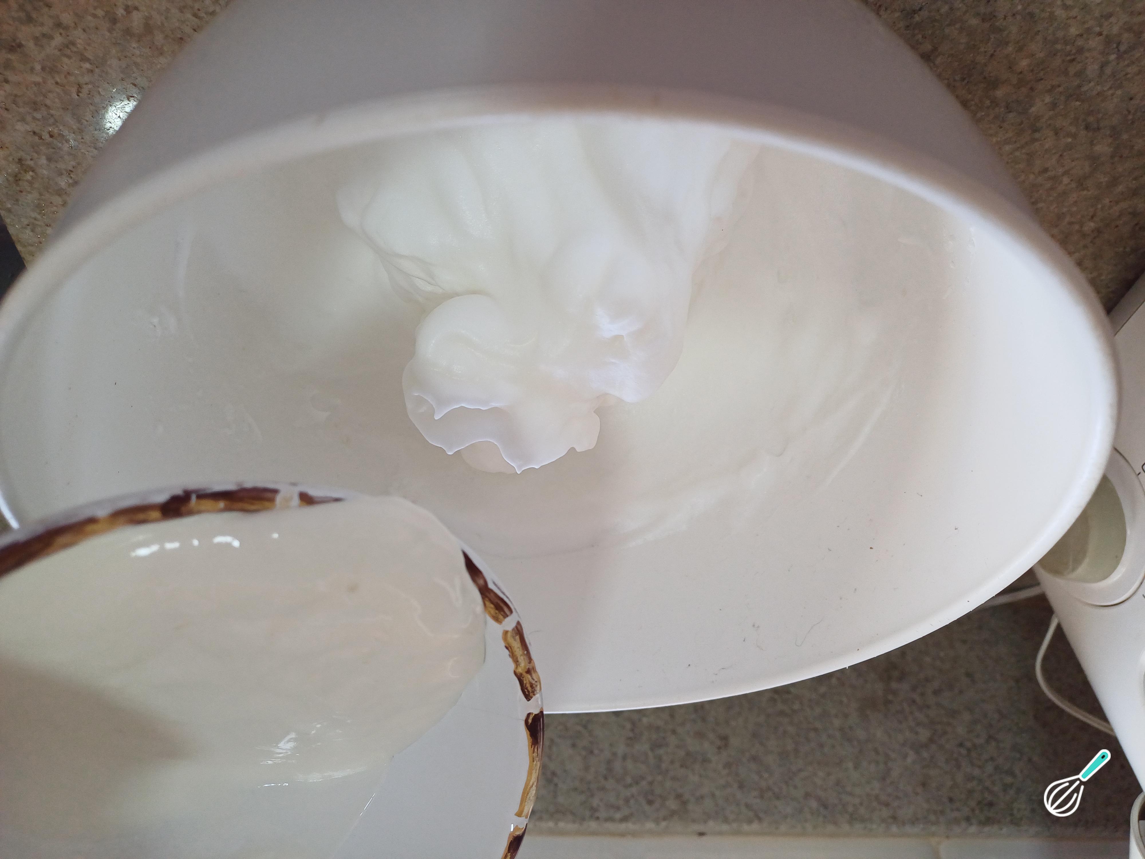 Para a cobertura, bata as claras em neve com o açúcar até obter um creme consistente, adicione o creme de leite e misture delicadamente. Reserve.