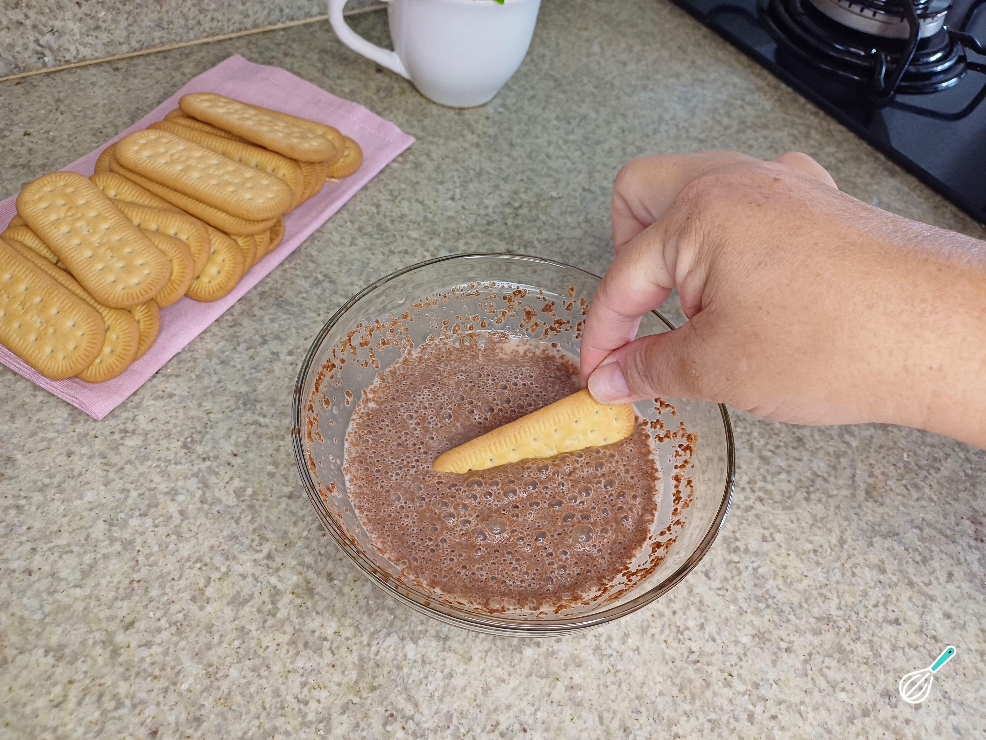 Em uma tigela misture o leite e o chocolate em pó até que esteja completamente dissolvido. Molhe as bolachas e reserve.