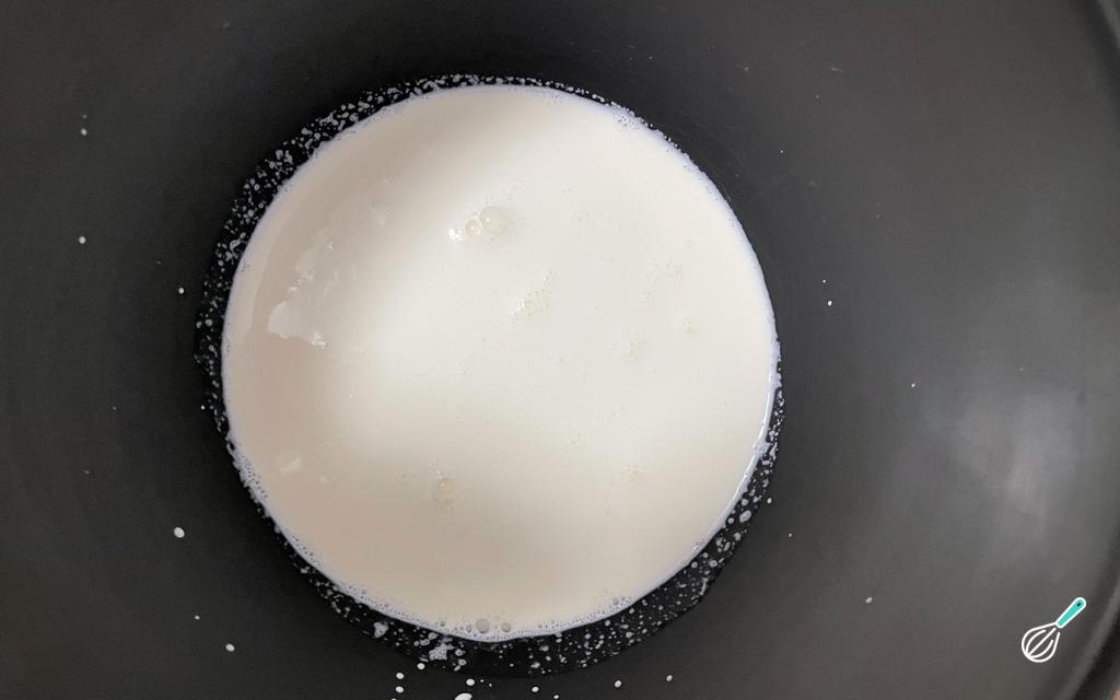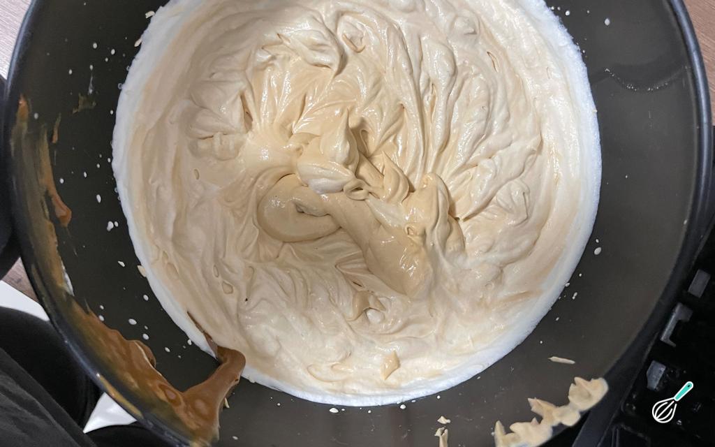 Pode ser difícil ficar 100% homogêneo, o importante é não ficar muitas partes só de creme de leite fresco batido. Numa tigela separada, adicione o café coado com a baunilha.