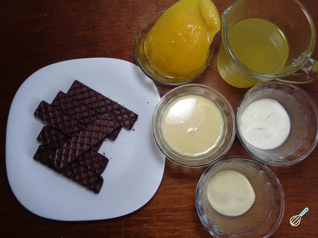 Na imagem você pode ver os ingredientes que vai precisar para a preparação do pavê de manga com bolacha de chocolate.