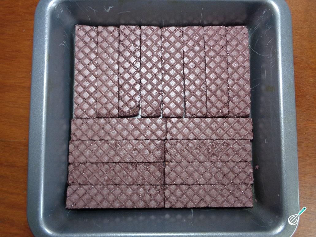 Comece a preparação desta sobremesa fácil cobrindo a base de um refratário com uma camada de bolacha de chocolate, evitando deixar espaços entre eles. Reserve.