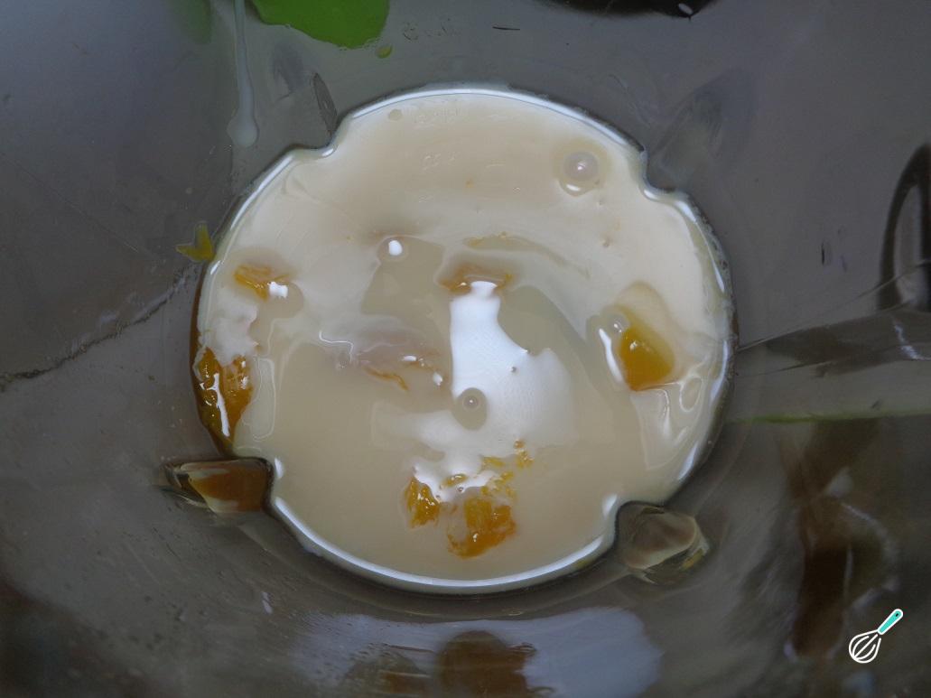 Bata o leite condensado e a manga em calda (sem calda, apenas a fruta) no liquidificador até formar uma mistura bem homogênea. Reserve.